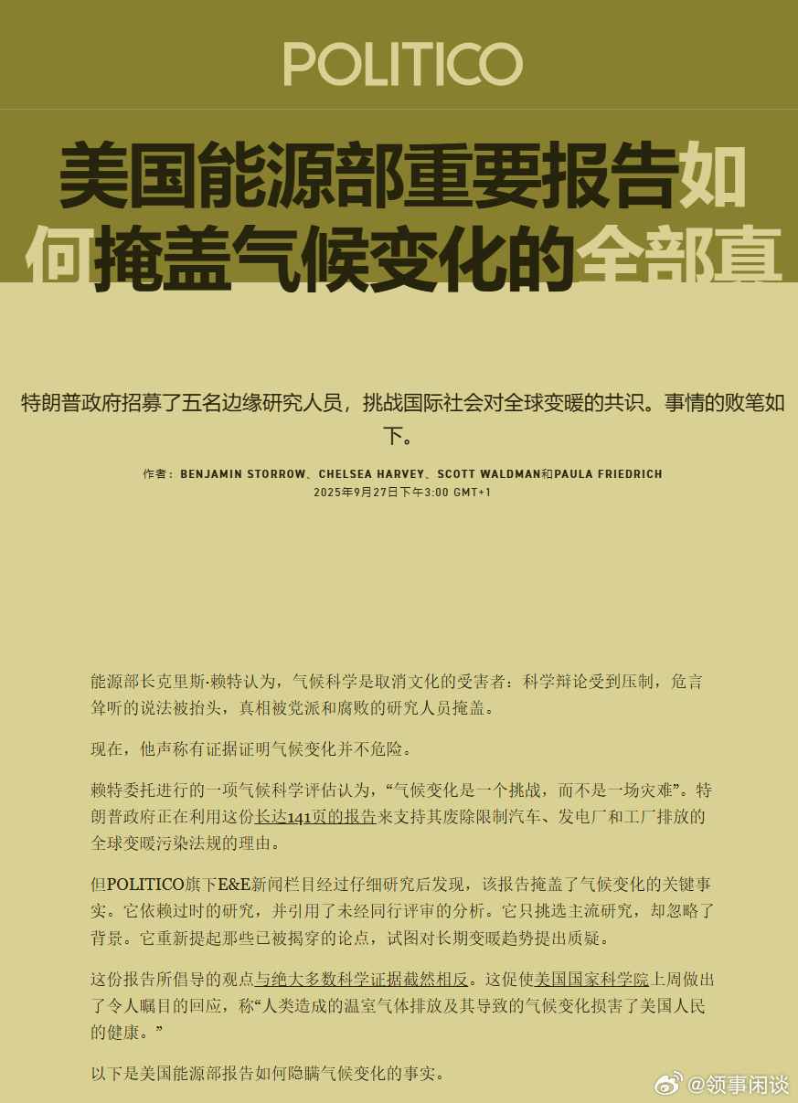 (政治报, DS缩写)根据E&E新闻的调查,美国能源部发布的一份气候科学评估报告严重歪曲了气候变化的真实情况。这份由能源部长克里斯·赖特委托、仅由五名长期处于科学界边缘的研究人员撰写的报告,与联合国政府间气候变化专门委员会由全球743名专家共同参与的综合评估形成鲜明对比。