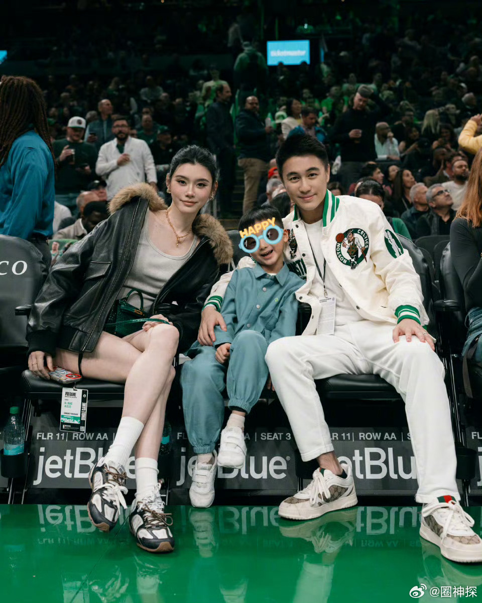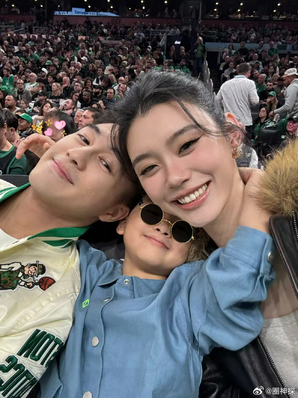 奚梦瑶晒出的一家三口合照也太甜了吧!何猷君穿着凯尔特人队球衣,和她头挨着头,中间