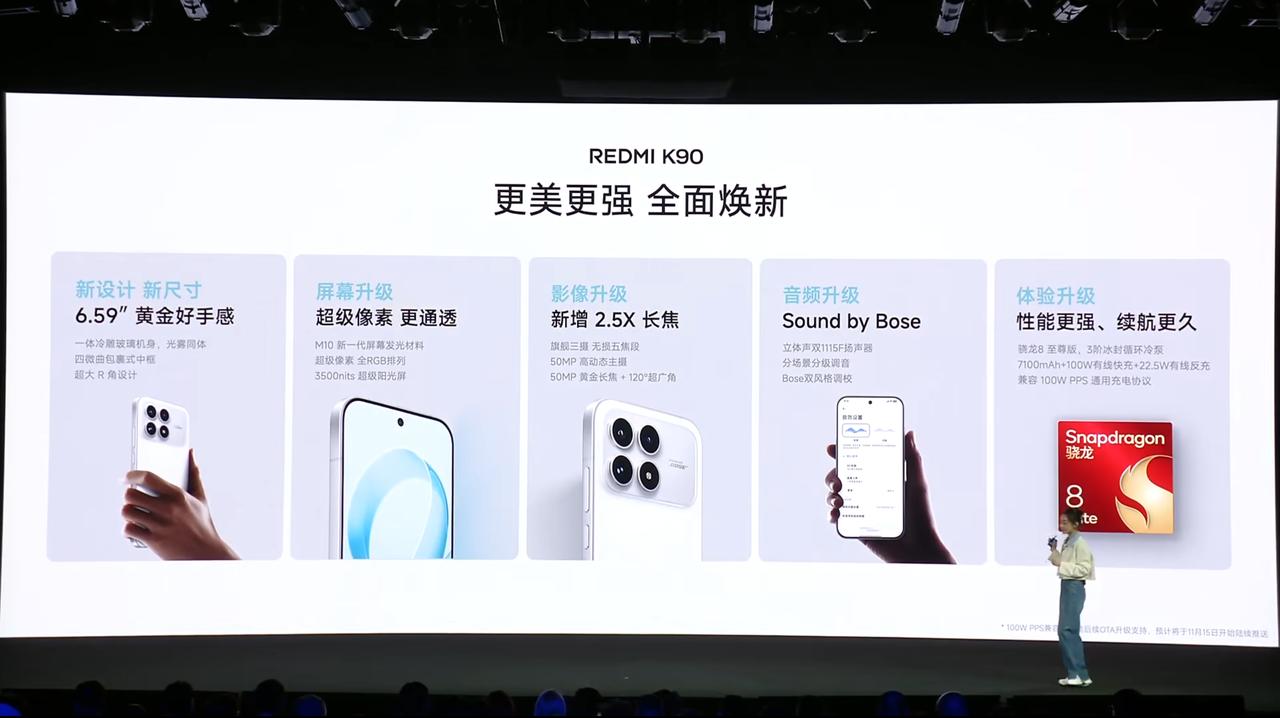 REDMI K90 发布,定位变成了黄金中尺寸旗舰,新设计主打果味质感,12+256GB 售价 2599 元、16+256GB 售价 2899 元、12+512GB 售价 3199 元、16+512GB 售价 3499 元、16GB+1TB 售价 3999 元。 - 芯片:骁龙 8 至尊版移动平台,LPDDR5X 内存,UFS 4.1 闪存,5300mm² 三阶凸台冰封循环冷泵,狂暴引擎 5.0,小米自研信号澎湃 T1+ 芯片; - 屏幕:6.59 英寸 2510×1156 华星 M10 OLED 直屏,超级像素(Real RGB 排列),手动最高亮度 600nit、全屏激发 2000nit、25% 窗口局部峰值亮度 3500nit,最低亮度 1nit,支持 120Hz 刷新率(LTPO),全亮度类 DC 调光,圆偏振光 2.0,全链路 10bit 色深; - 相机:前置 20MP(豪威 OV20B40),后置 50MP 主摄(光影猎人 800,1/1.55",OIS)+ 50MP 长焦(豪威 OV50M,1/2.88")+ 8MP 超广角(豪威 OV08F)三摄; - 续航:7100mAh 小米金沙江电池(10% 硅含量),支持 100W 快充,22.5W 有线反向充电,兼容 100W PPS 协议; - 其他:厚 8mm,重 206g,玻璃后盖,有黑色、白色、水蓝色、浅紫色 4 款配色,支持 NFC、红外遥控、蓝牙 5.4、Wi-Fi 7、超声波指纹、IP68 & IP69 防尘防水、0809 X 轴线性马达、USB 2.0, 双 1115F 扬声器,Bose 调音,搭载 HyperOS 3.0 系统。