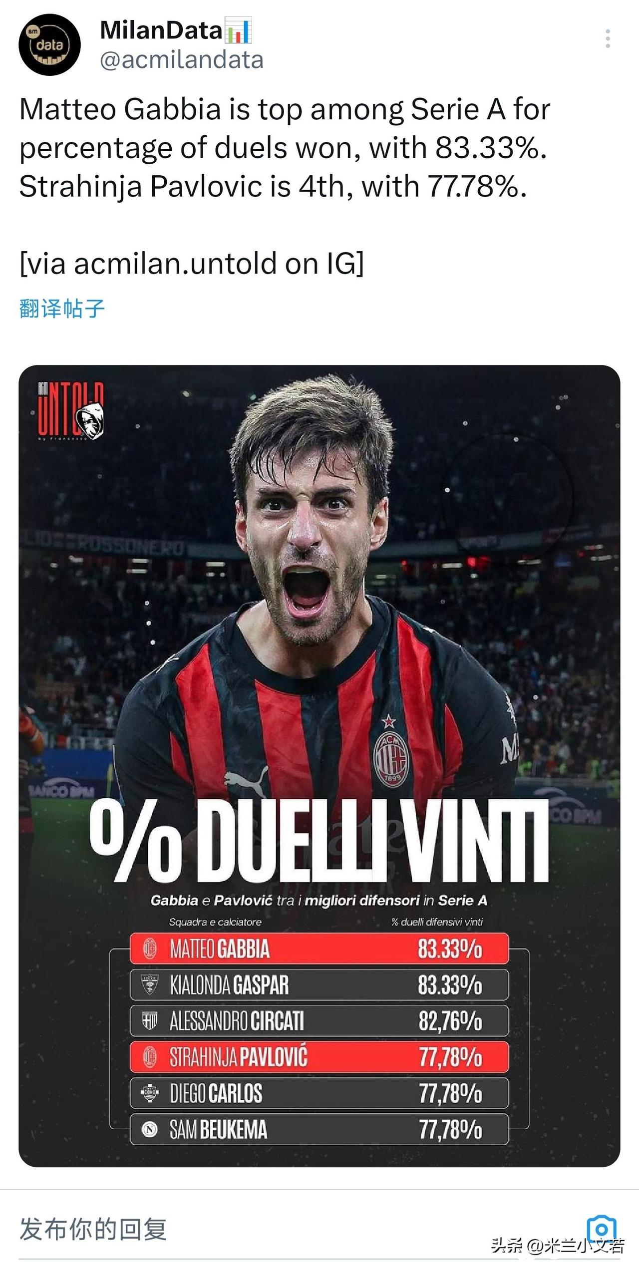 加比亚对抗能力意甲第一!意甲联赛迄今为止对抗能力排行榜米兰后卫加比亚名列第一,另外一名球员帕夫洛维奇排名第四。这个是真的没想到,如果说对抗无论怎么想都应该是帕夫洛维奇第一,真的没想到是加比亚。 加比亚最强的能力是他对比赛的阅读能力,无论是马尔蒂尼还是科斯塔库塔都说过加比亚是米兰后防线唯一有阅读比赛能力的球员。我理解的阅读比赛能力是打那不勒斯和尤文图斯的拦截,能清楚分析对手行球路线,可以阻截破坏对手进攻,说对抗能力真的没想到,感觉对抗这样的事情,还是需要帕夫洛维奇这样的,从长相到身材咋看咋都适合去身体对抗。 个人觉得就是我们个人习惯的问题,一直看意甲,对后卫的理解就是巴雷西、马尔蒂尼或者优雅的内斯塔,当然是不打架时候的内斯塔,他们靠预判和选位,所以都越老越妖,米兰后防线那时候有个斯塔姆,当时感觉斯塔姆就是干脏活累活的,很正常对应现在加比亚是那个选位预判指挥的人,帕夫洛维奇是那个干脏活累活的,现在看球迷水平就是球迷水平,也许当年队长和内斯塔同样对抗能力等同样出色,只是看着长相清秀。