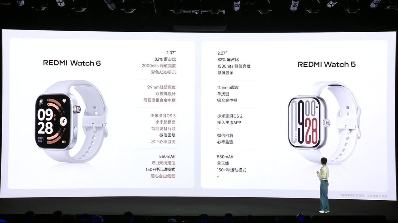 Redmi Watch 6 发布:售价 599 元。 2.07 英寸 432×514 OLED 方屏,82% 屏占比,60Hz 刷新率,支持 5Hz 彩色 AOD 熄屏显示,局部峰值亮度 2000nits;四通道心率传感器(双灯双 PD),150+ 种运动模式,双 L1 天线,支持独立定位功能,24 小时心率监测、全天候血氧智能监测、睡眠监测、压力检测、呼吸训练、女性健康等;550mAh 电池,典型模式续航可达 24 天,磁吸式充电;支持 NFC,厚 9.94mm,手表净重 31g,皎月银、典雅黑、迷雾蓝 3 款配色,铝合金表壳不锈钢表冠,支持 5ATM 防水,搭载 HyperOS 3 系统。