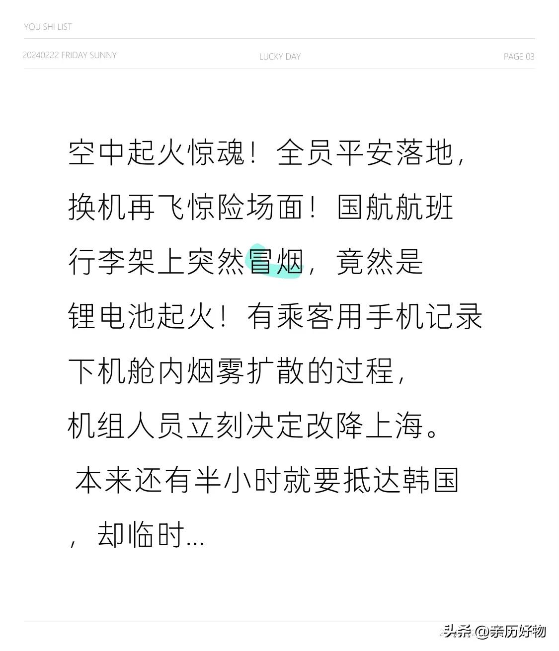 空中起火惊魂!全员平安落地,换机再飞 惊险场面!国航航班行李架上突然冒烟,竟然是锂电池起火!有乘客用手机记录下机舱内烟雾扩散的过程,机组人员立刻决定改降上海。 本来还有半小时就要抵达韩国,却临时转向,没想到收获全机乘客的掌声——处理得太专业了,零人员伤亡,关键时刻显实力!✈️ (飞行安全真的不能马虎,给这份冷静和责任心点个赞!) 紧张时刻转眼成了暖心回忆!国航航班行李架冒烟,视频里烟雾弥漫,但空乘人员冷静应对,迅速取出灭火器,只用了几秒钟就扑灭火源,机长也果断调头备降上海浦东。原本再飞一会儿就能到韩国,全机人反而一起鼓掌——操作零失误,这波必须夸! 有亲历的乘客提到,当时机舱里烟味很重,头顶的行李架都被熏黑了,但乘务组一边安慰大家,一边快速处理火情,还有乘客主动帮忙给老年旅客遮挡口鼻。下午两点多,全部乘客换乘另一架飞机继续行程,国航这次的应急反应真的超专业。 锂电池简直是飞行中的隐藏危险!这次幸好遇到经验丰富的机组,但如果随身带的充电宝没有妥善包装,下次还能不能这么顺利?你们坐飞机时都是怎么保管手机、平板这些电子设备的?快来分享一下你的安检心得! 客机行李架起火 飞国外飞机起火 机场起火 国航遇险 客机机头着火 客舱起火