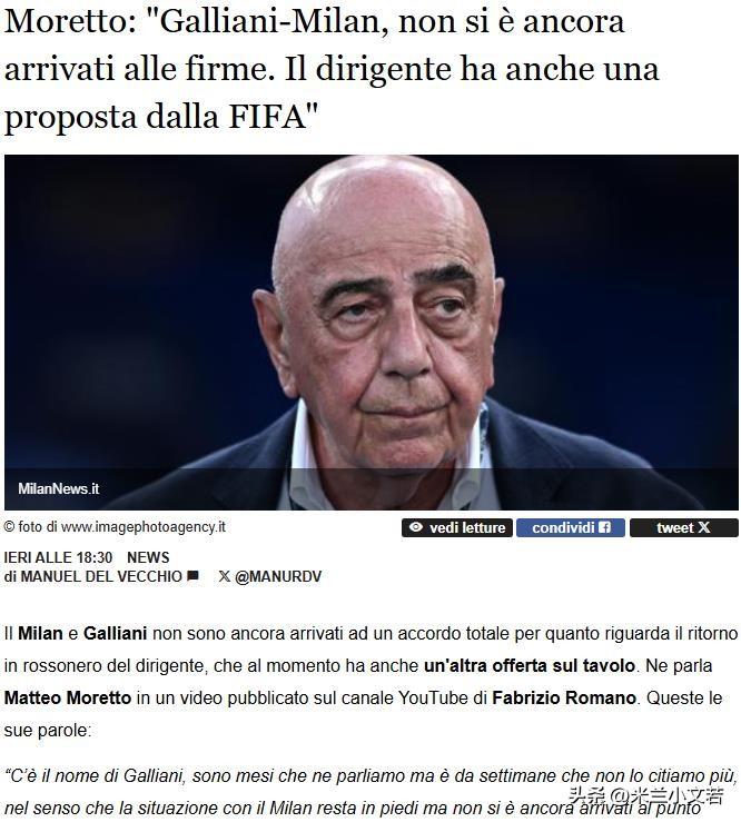 米兰与加利亚尼谈判依然在继续!米兰与加利亚尼的谈判前后已经解决三个月,这个谈判依然在继续,只是还没有达到最终签字的阶段,原因是米兰迄今为止也没有明确界定加利亚尼在米兰的角色。 最早说加利亚尼会作为米兰主席,就是斯卡洛尼那个位置,后来米兰与米兰市政府谈妥了新球场,貌似斯卡洛尼地位就不可撼动了,后来大概就是上个月说希望加利亚尼成为类似体育总经理的职位,弗拉尼会计负责财务,加利亚尼负责竞技,他管理塔雷与蒙卡达,但直到今天也没有啥具体消息。 今天消息是加利亚尼目前还有一份来自FIFA的报价。FIFA说加利亚尼是一个备受青睐的人物,我们当然期待加利亚尼可以加盟我们,为足球事业发展做出贡献。FIFA有点不要脸了,当然咋对米兰的,现在加利亚尼为足球做出贡献?之前呢?之前是谁阻止加利亚尼为足球发展做贡献。