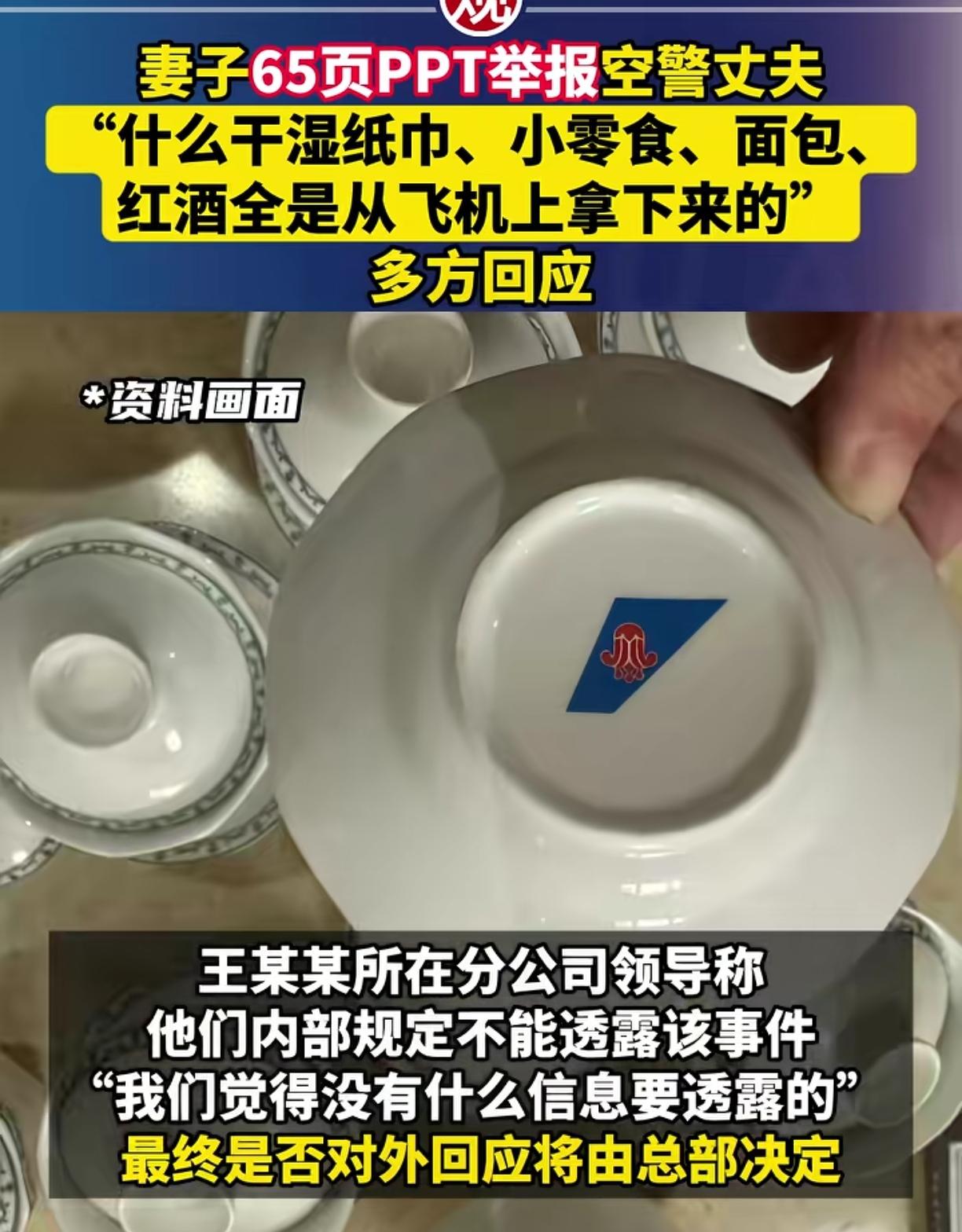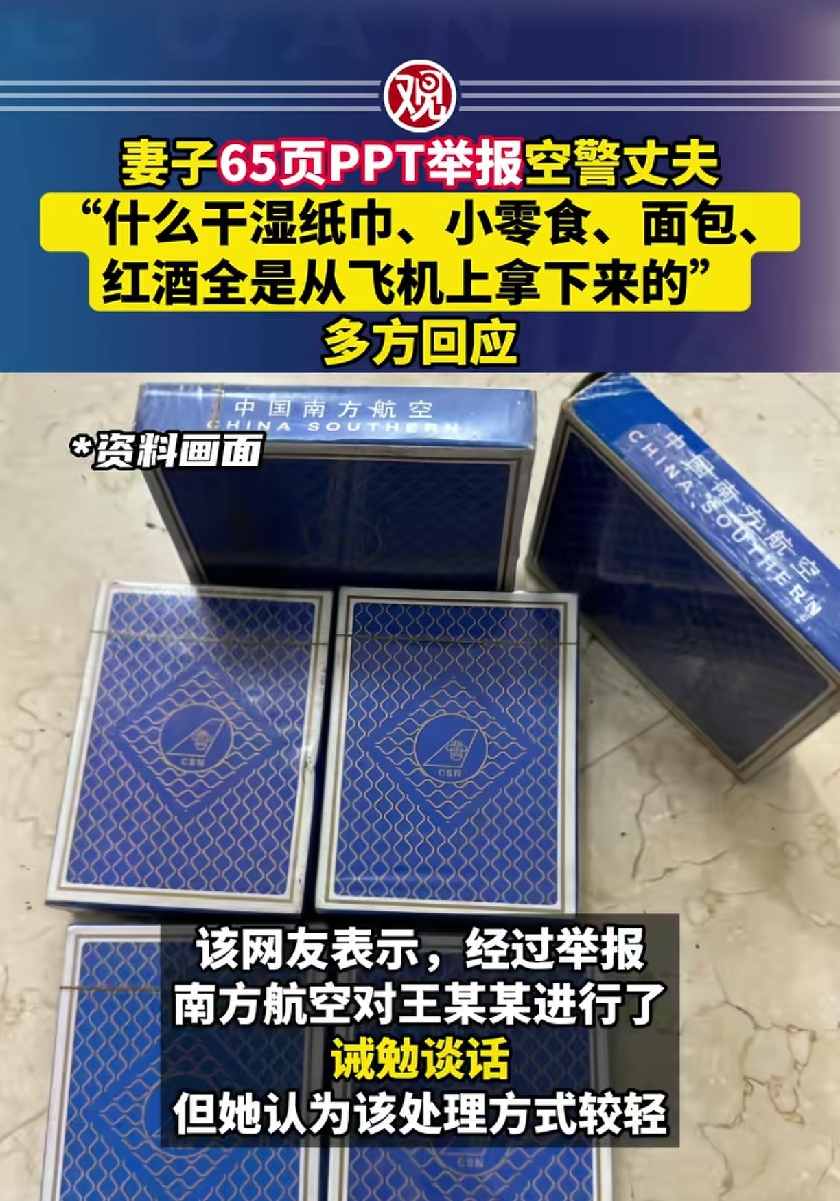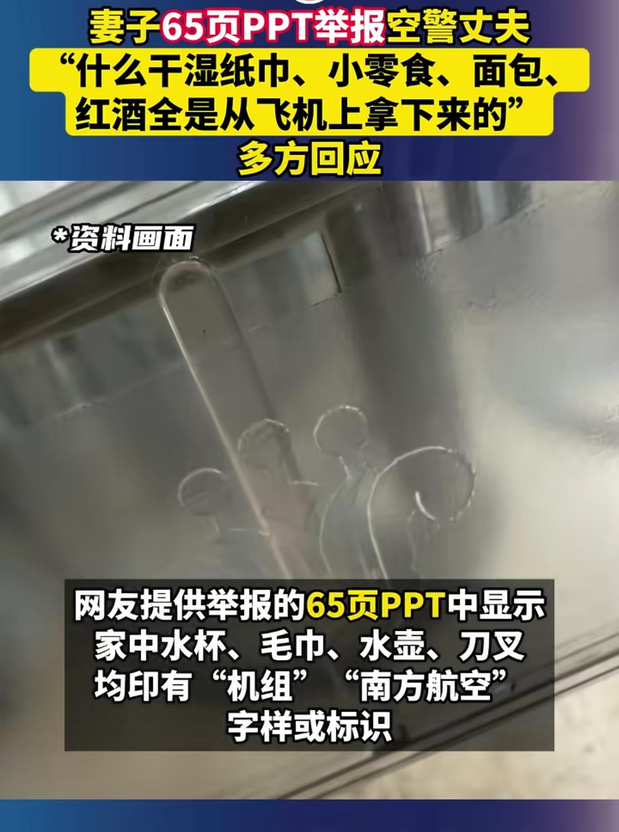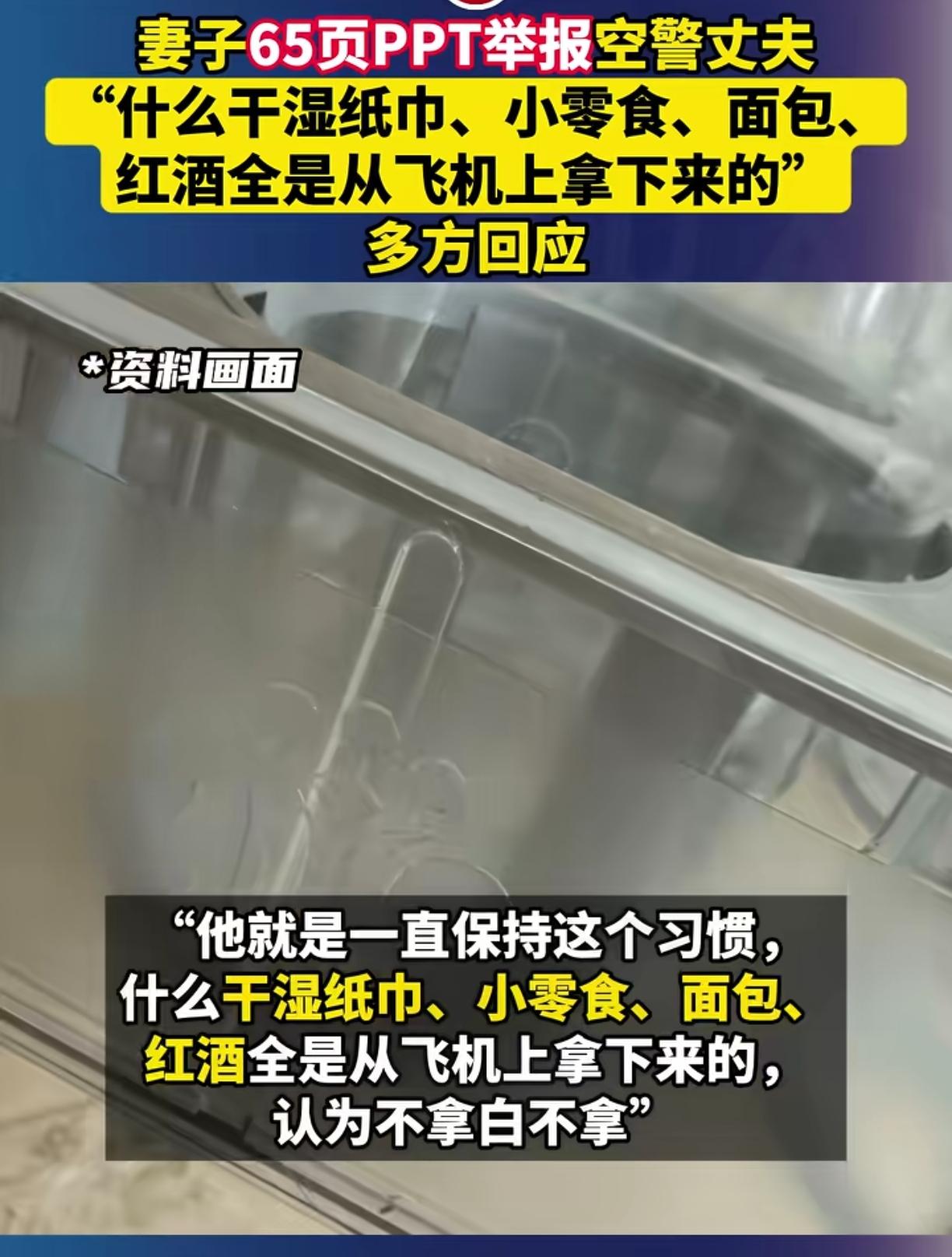 妻子65页ppt举报南航空警丈夫 多年来偷盗机舱中的干湿纸巾,小零食,面包,红酒等物品放置家中 还有很多水杯,茶壶,毛巾,刀叉等生活用品,其实挺好奇该女子这么多年吃了没?用了没? 如果吃了,用了的话,知情不报,算的上从犯吧! 更多的是不懂她这举报的动机在哪,大多数人看到的都是这男的勤俭持家啊,整整65页ppt,至少现在给我们展示的这些是没有重点的内容啊,这里面是不是有隐情? 如今南航的处理就是和王某进行了诫勉谈话,女子认为这处罚也太轻了! 而涉事男子回复“这个事情由公司出面答复,自己不方便说太多”。 说实话,好怕领导看完ppt 点了根烟说“小王家里有困难要及时跟领导说”! 正常人都认为这不是事,要是当盗窃处理了多少打工人的天都塌了 听说这女的现在使劲在控评论,删评论,做两张截图就想带节奏,真有证据还用拿玻璃杯扑克牌纸巾举报啊 搞不懂这女的到底在想什么,有事私下好商量,直接网络上爆料,就这证据,这力度,好像啥也处理不了。 你们怎么看这个事?