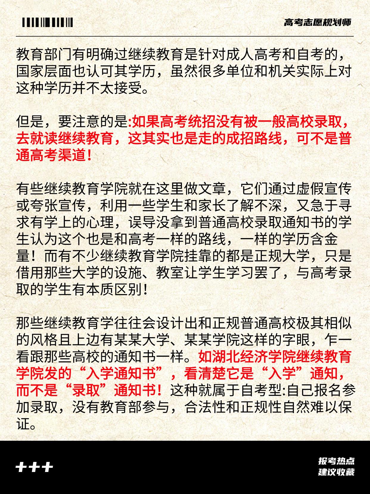 (2026 高考志愿填报知识分享) 警惕!高考录取陷阱,擦亮眼莫掉坑。 每年教育部门和官媒都会发文或发布一些信息,警示高考学子与家长不要被高考录取骗局给骗了。以前有专门公布过各地的“野鸡”大学,随着现在信息传播越来越快,获取也变得更加容易,那类“野鸡”大学大概是没有前些年好骗人了。 但是,有一种陷阱,可能很多人难以辨别。今年依然有一些同学还是莫名掉坑了。那就是一些继续教育学院的招录! 孩子即将高考,开始学习志愿填报知识,为孩子填报努力!