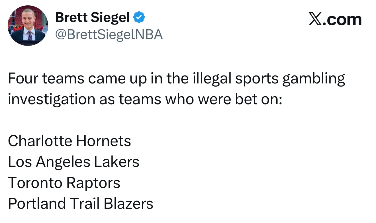 Brett Siegel:这次赌球案调查中,提及的四支被下注球队为:黄蜂、湖人、猛龙和开拓者。