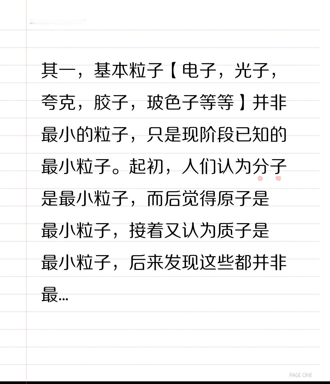 其一,基本粒子【电子,光子,夸克,胶子,玻色子等等】并非最小的粒子,只是现阶段已知的最小粒子。起初,人们认为分子是最小粒子,而后觉得原子是最小粒子,接着又认为质子是最小粒子,后来发现这些都并非最小粒子。 其二,量子是一种状态,即量子态,并非一种单位。物质以往只有固态、液态、气态,如今新增了量子态,未来或许还会有其他状态,截至目前,仅有这四种状态。 其三,人类至今尚未弄清楚磁究竟是什么,更别提光是什么、量子态是什么了。究其缘由,在于无法对其进行观察和测量。若能对磁、光、量子态进行测量和观察,或许就会发现更小的粒子。磁、光、量子态的传播载体是什么?为何它们没有质量?为何磁和光的速度如此之快? 四种力,即磁力、强力、弱力、引力,以什么为载体?传播速度是多少?