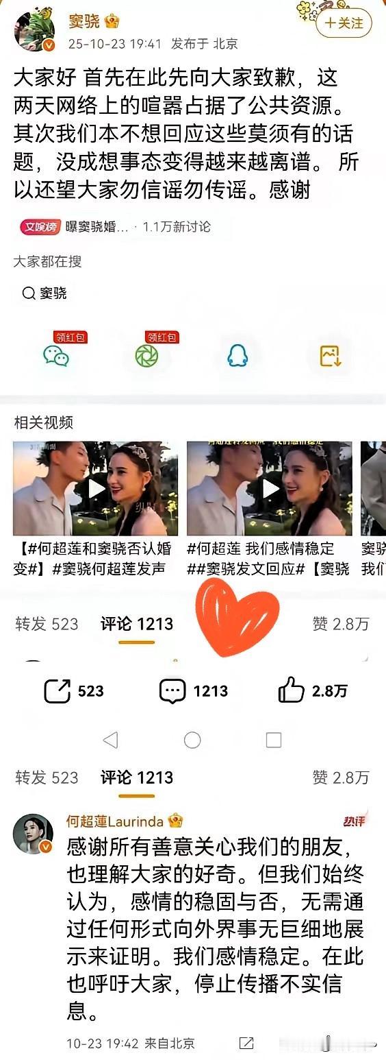 我的天, 迟来的道歉,我以为会是向太, 万万没想到,居然窦骁出来道歉,超莲跟在后面感谢。 10月23日,窦骁和何超莲在北京一起吃饭,没人发微博,也没开直播,窦骁只说了一句让大家担心了,何超莲在旁边点点头,笑了笑,大家本来以为出了什么事,结果发现他们只是想说,感情挺好的,正打算要孩子。 他们从2018年在一起,2022年订了婚,一直没怎么往外说,这次出来,不是为了炒热度,实在是听不下去外面那些话了,有人说他们早分了,有人说何家不认这个女婿,他们没开口辩解,但用行动让大家看到,他们过得不错,用不着谁来替他们说。 很多人盯着这对夫妻,是因为窦骁不是豪门出身,大家总在想他能不能配得上何超莲,女生结婚被当成人生大事,男生却没人问,媒体最爱把沉默当问题,把亲密当秘密,其实窦骁从不靠热搜刷存在感,他稳得住,这正是何超莲最看重的。 何超莲以前说过,她想以后家里组个足球队,这话听着像开玩笑,可她是认真的,她喜欢运动,也喜欢一家人一起玩,要是真有了孩子,踢球大概就成了每天的事,这不是炫耀什么,就是她想过的生活。 他们不解释,也不表演,公众总把婚姻当电视剧看,可真正的情分,往往藏在不说出口的那些时候,那天他们一起吃饭,就是最好的回应。