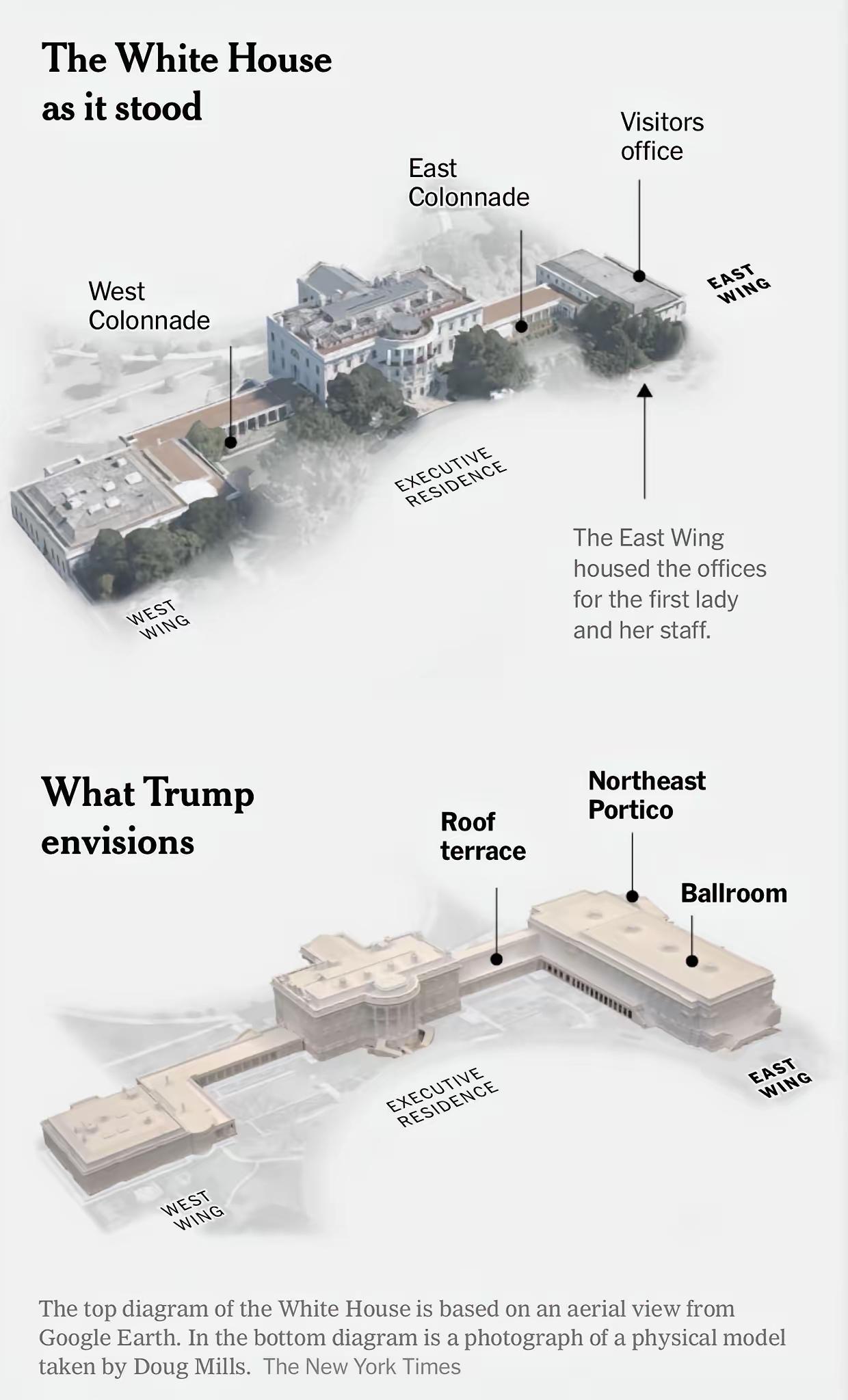 太魔幻了吧!白宫扩建名场面:停摆期的"美妙音乐"太刺耳! 华盛顿的魔幻现实主义名场面,最近被白宫承包了。一边是75万联邦雇员排队领救济,一边是挖掘机铲碎白宫东翼的百年砖墙——耗资2.5亿的豪华宴会厅,偏要赶在政府停摆时开工 。 特朗普在午餐会上把钻机声夸成"美妙音乐",说这声音让他"想到钱" 。 确实该想:8300平米的宴会厅比白宫主楼还大,能塞1000人,防弹落地窗配水晶灯,单材料钱够买几百所学校的教材。 更绝的是操作:绕开停摆的规划委员会审批,拆了第一夫人办公室和百年老树,还刚宴请完拿联邦合同的企业金主。 白宫说这是"必要扩建",网友吐槽:这哪是建宴会厅,分明是给"付费入场"的金主搭戏台。 当救济队的脚步声撞上施工队的轰鸣,这声"美妙音乐",恐怕只有特权阶层听得见回响。