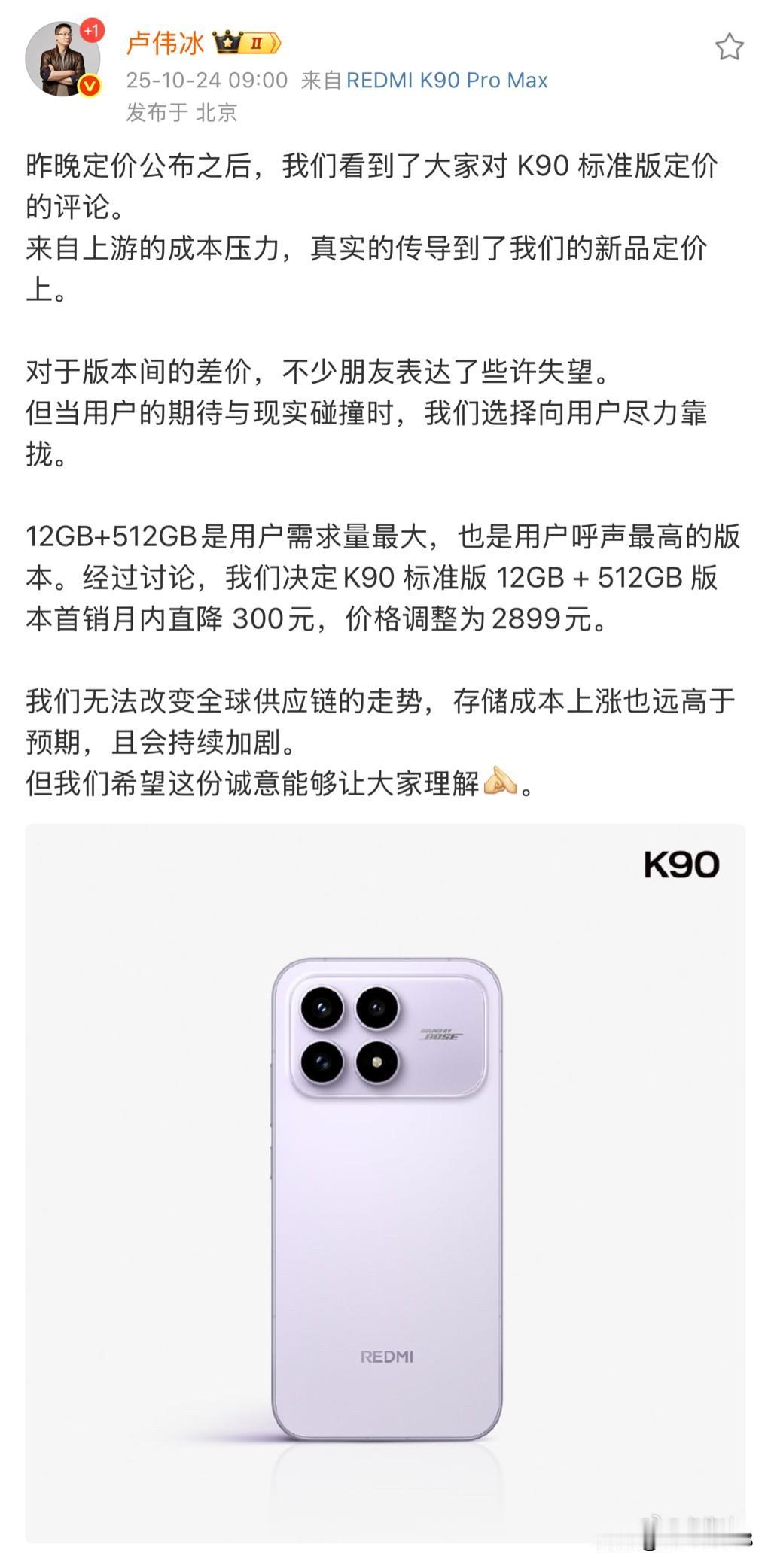 REDMI K90 标准版调价,12+512GB 版本首销月内直降 300元,价格从 3199 元调整为 2899 元,和 16+256GB 同价。[灵光一闪]