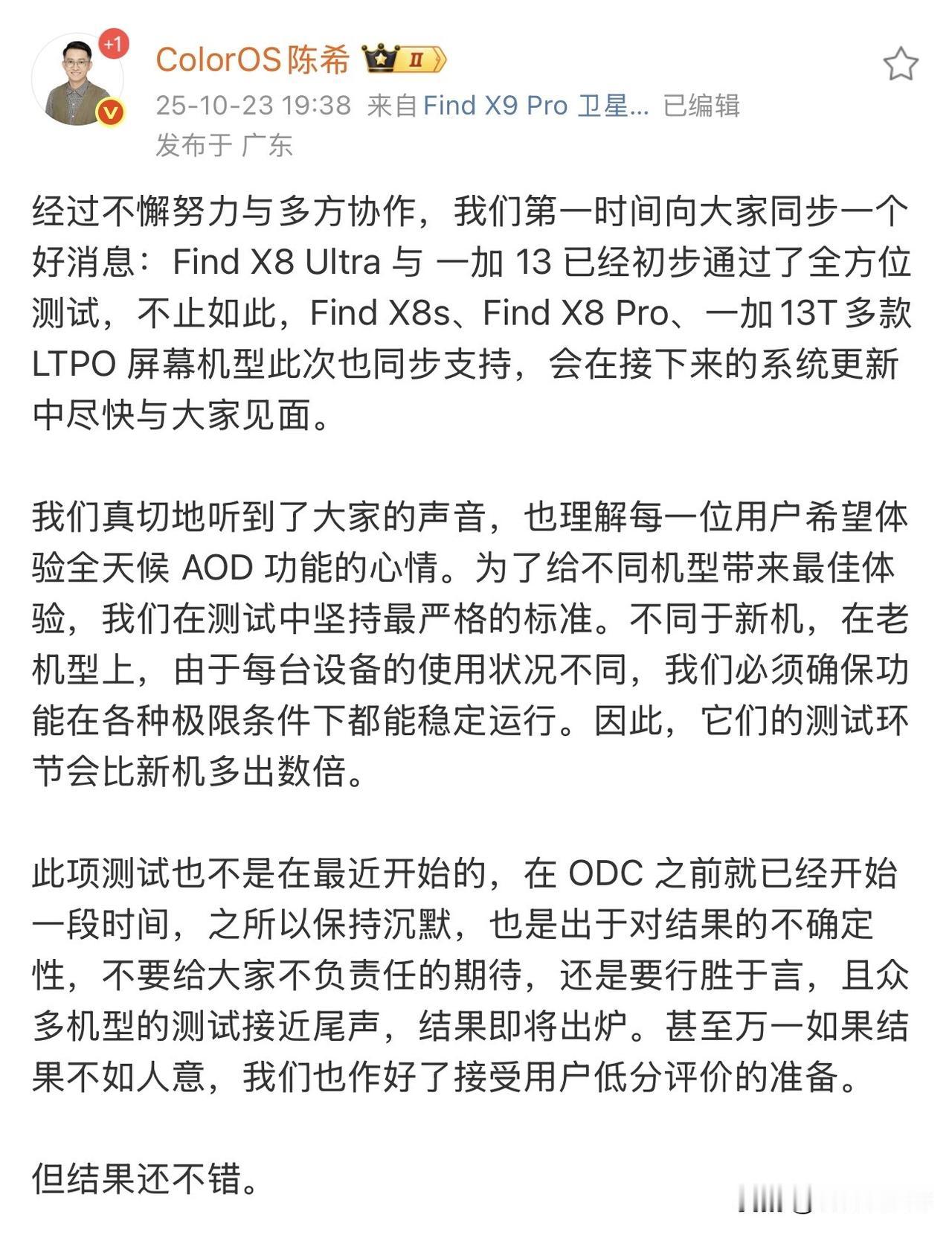 好消息,OPPO Find X8 Ultra、Find X8s、Find X8 Pro、一加 13、一加 13T 等多款 LTPO 屏幕机型即将支持全天候 AOD 显示。[灵光一闪] 不知道后面真我的 LTPO 机型会不会也支持呢?也顺手适配吧。[偷笑]