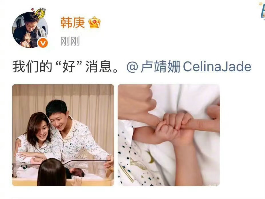 韩庚卢靖姗二胎得子,韩庚:我们的“好”消息!
