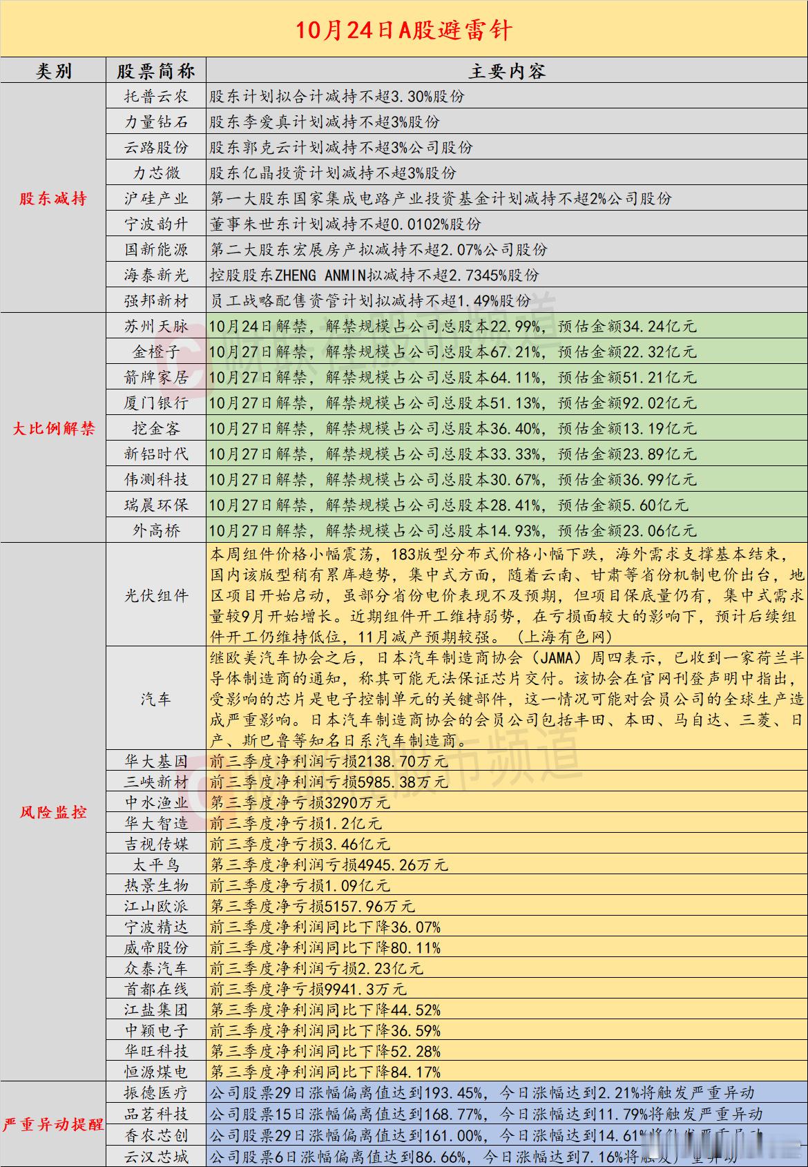 【10月24日投资避雷针:600亿半导体材料龙头或遭国家大基金减持】近日,A股及