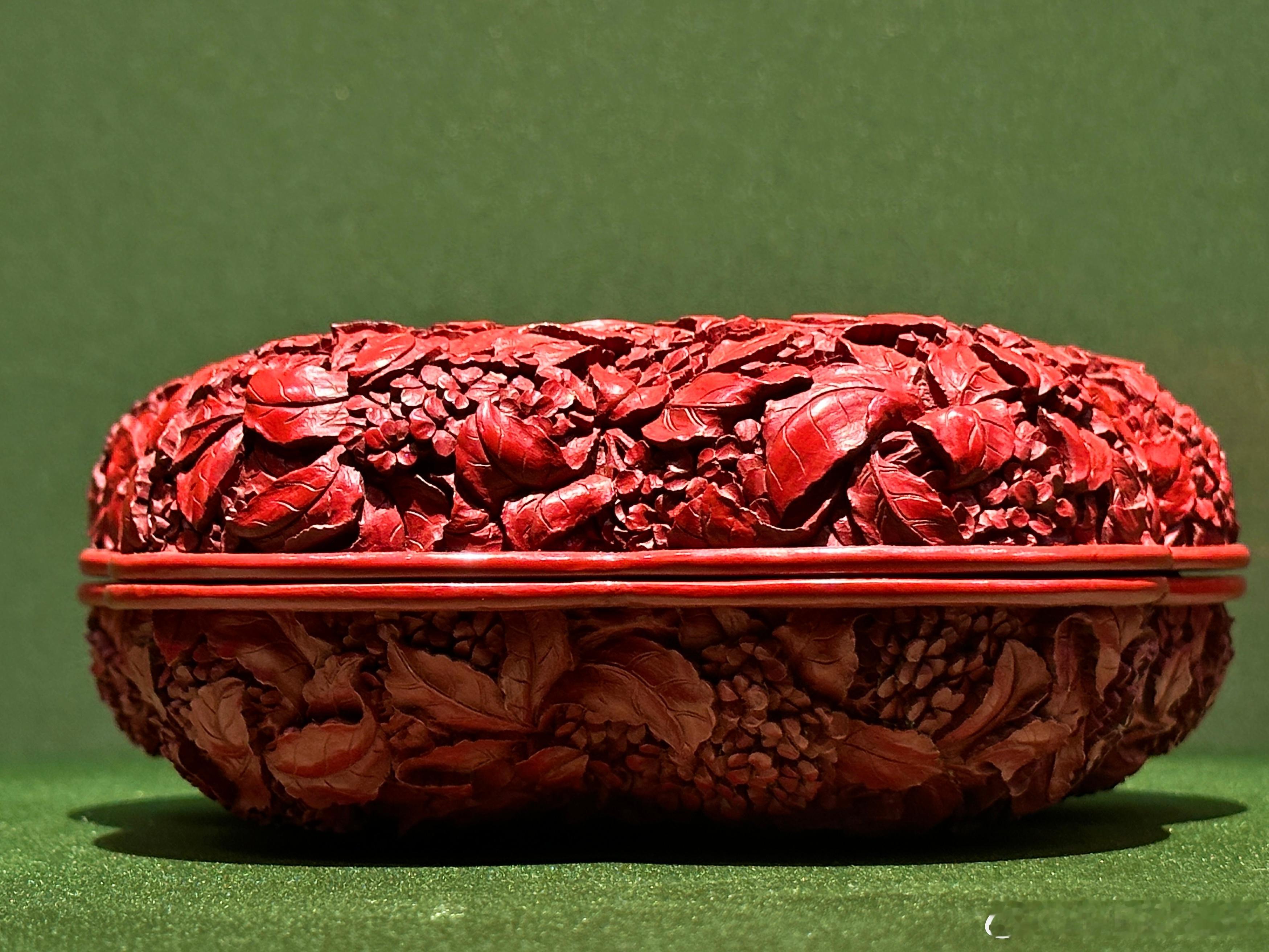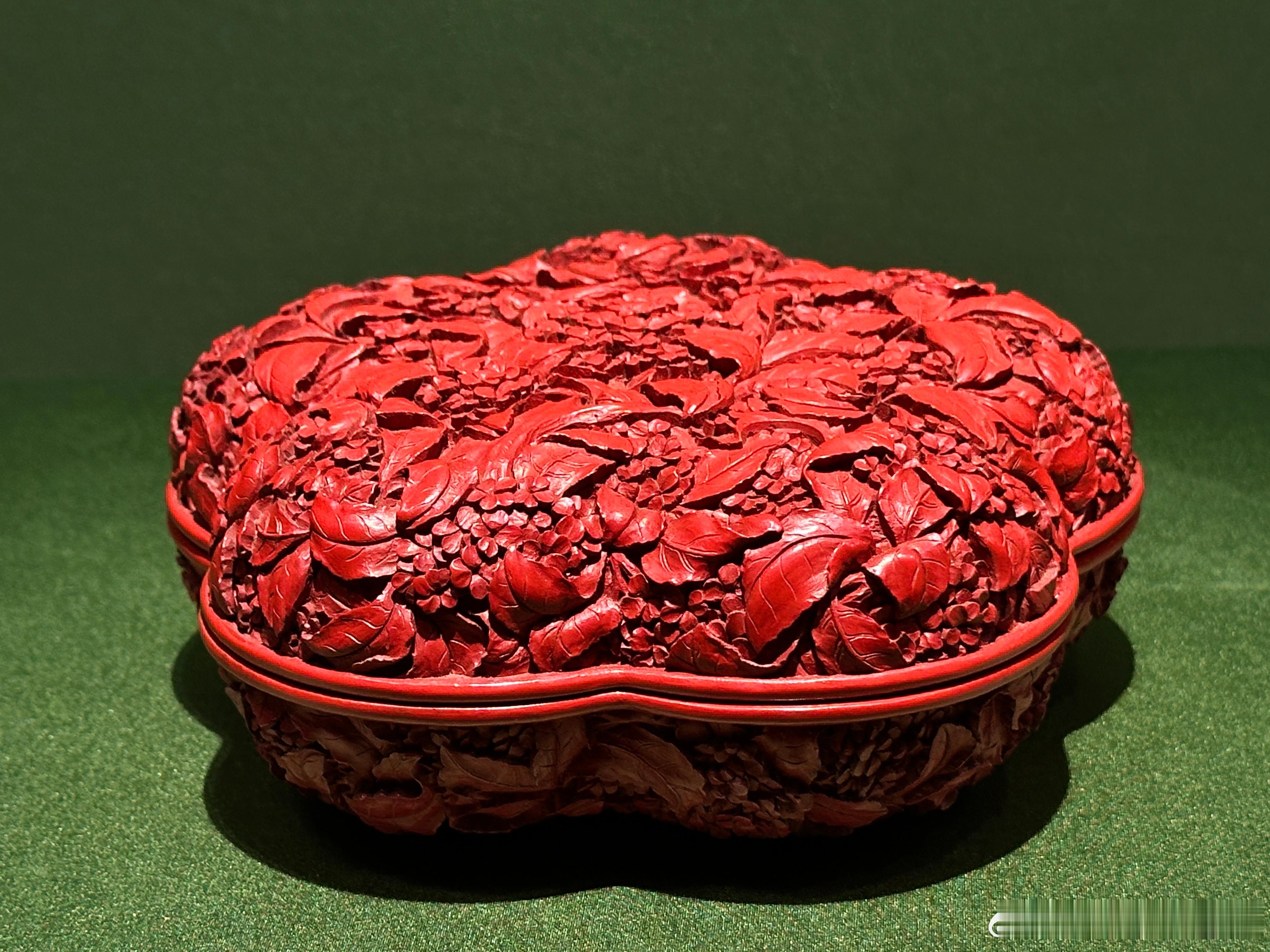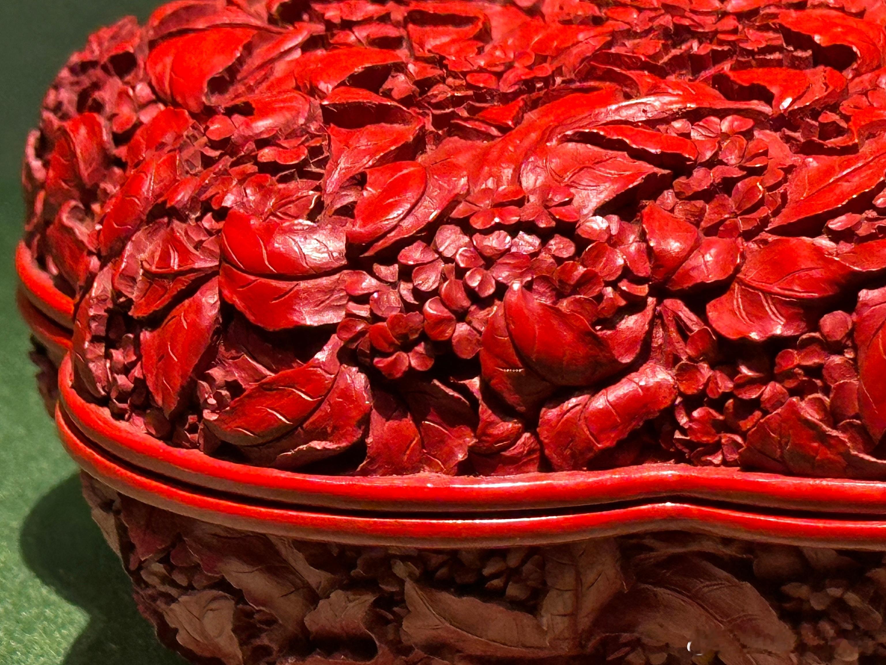 盒木胎,梅花式。通体髹朱漆,满雕桂花纹。内里髹黑漆。盖内中心刻楷书“团香宝盒”款。身内中心刻楷书“大清乾隆年制”款。盖、身外壁各雕一株桂花,枝干时隐时现,脉络分明。花瓣细小,叶子掩映其间,俯仰翻卷,得自然之趣。