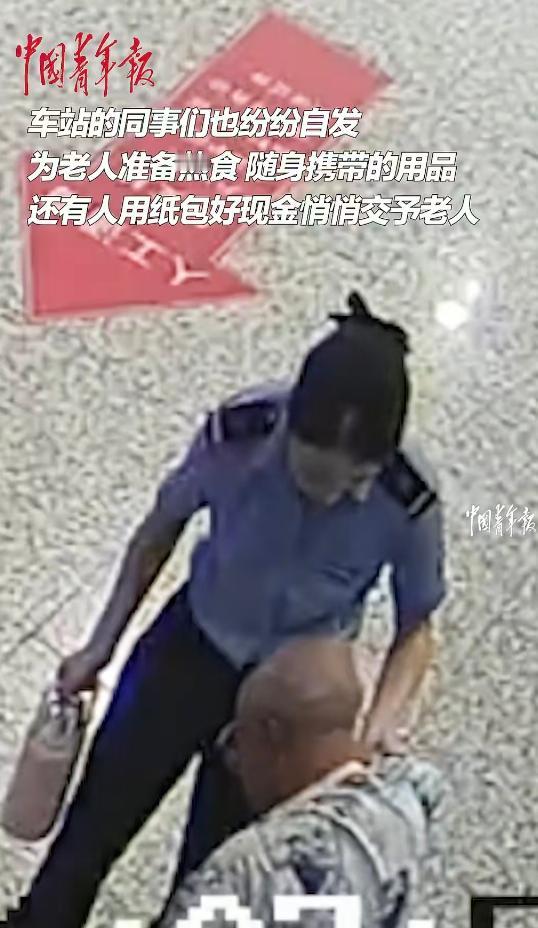 四川宜宾,一位七旬老人在问完车次问题后,就坐在候车室里啃着随身带的馒头,这时,刚才被询问的工作人员突然找到了老人,不由分说的就要带老人往外面走,而出去之后,老人当场向工作人员下跪致谢。网友:你的举手之劳却暖了老人的心房。 原来,这位女工作人员在被老人问完之后,越想越不对劲,因为老人身上穿的衣服太薄了,现在气温低,根本不防寒,担心老人遇到了什么困难,于是把工作暂时交代给了身边的同时,就在候车室内寻找起老人的身影。 没一会儿,工作人员就找到老人,看着老人正在啃一个冷馒头,就上前询问老人的情况,原来,老人正是生活遇到了困难,无奈之下只能独自去到内江寻亲,而自己的所有家当都装在了随身的塑料袋里。 工作人员见老人遇到了困难,拉着老人就去了站内的超市,给老人买了泡面,面包,八宝粥...... 买完之后,又带着老人去车站内的面馆吃了碗热气腾腾的面条,看了看内江的天气,还贴心的给老人准备了一把伞,担心如果下雨老人来车站都出不去。 看着一个素不相识的陌生人为自己忙前忙后,给自己买了这么多东西不说,还这么贴心的给自己买面条买雨伞,老人的情绪再也控制不住了,眼眶早就红了,当场下跪想对工作人员表示自己的感谢。工作人员也赶紧蹲下身子,把老人搀扶起来。 更令人动容的是,车站内其他工作人员见到这一幕也都知道了,纷纷自发给老人准备东西,有的给老人买食物,有的给老人买生活用品,有的甚至特意换好了零钱用纸包着,悄悄送给了老人...... 老人看着身边这帮热心的年轻人,感动的话都说不出来了,在一旁轻轻的抹着眼泪,可能对老人来说,这么多年了,还从未有人这么关心过自己,跟自己血脉关联的亲人对自己爱答不理,可没想素不相识的陌生人却对自己表达了真温暖的善意。 那位女工作人员说:每个人家里都有老年人,都是举手之劳 就像网友说的,你的举手之劳,温暖的却是老人的心房,老话说,锦上添花易雪中送炭难,当一个人有钱的时候,身边自然有不少人谄谀献媚,争先帮助;可当人老了,没有钱了,成为别人眼里的累赘了,又有几个人愿意伸出双手帮一把? 女工作人员和她的同事们,正是这雪中送炭的好心人,在老人遇到困难,没有依靠的时候,主动伸出双手,不求回报,只为了老人的生活能多一些善意,只希望这个寒夜之中能多一些温暖。 这种舍己为人的精神就是生活中最真实的热乎劲儿,一方有难八方支援,用自己最真实的温暖,感动了每一个人的心。 为车站的工作人员点赞,也祝愿老人能一切顺利,希望这份善心能被发扬下去,让每一个回家的游子都能在车站感受到回家的温暖。 素材来源:中国青年报