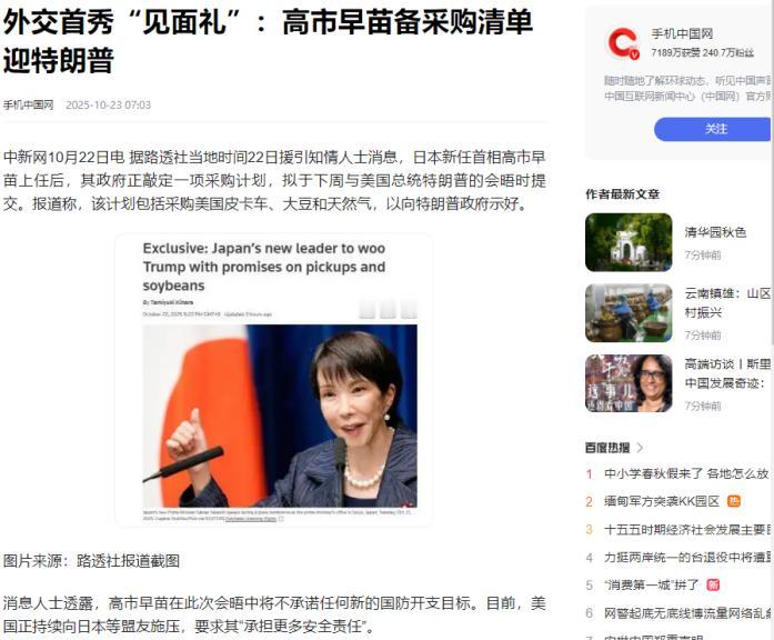 上台第二天,高市早苗就向特朗普表忠心,中国不买的东西,日本出钱买! 高市早苗21日就任日本首相,第二天就有消息人士向媒体透露,表示新一届日本政府正开始敲定一项购买计划,可能会在下周的美日接触中提交给特朗普。 那么日本要购买什么东西呢?美国的皮卡、大豆和天然气。这三样东西,没一样是自己真的需要的。 先看美国大豆,这简直是踩着中国市场的空缺递上的“投名状”。 就在高市敲定计划前几天,中国海关总署刚公布9月从美国进口大豆量降至零,而去年同期这个数字还是170万吨,中国的采购需求全转向了南美,仅巴西当月就供应了1096万吨,占中国进口总量的85.2%。 美国豆农正面临数十亿美元损失,急盼援助却因政府“停摆”无果,日本此刻站出来接盘,时机拿捏得精准又刻意。 可日本本土根本消化不了这些额外大豆,此前日美贸易协定生效已让日本农业预估减产最多1100亿日元,牛肉、乳制品等品类首当其冲,如今再涌入廉价美国大豆,只会让本就脆弱的日本农业雪上加霜,这种明知亏本还要买的操作,政治意图远大于经济需求。 美国皮卡的采购更透着荒诞。以计划中的福特F150为例,这类大排量重型皮卡与日本的交通环境格格不入——日本城市道路狭窄,停车位普遍迷你,本土车企主打的小型车占比超60%,皮卡市场常年被边缘化。 过去五年日本每年皮卡进口量从未超过3万辆,且多为工程用途,突然追加采购量无疑会造成库存积压。 更讽刺的是,高市早苗竞选时还吐槽此前日美贸易协议“不公平”,认为美国拿了更多好处,如今却主动购买这类非必需商品,说白了就是用纳税人的钱给特朗普送政绩。 天然气采购则暴露了更大的成本代价。日本本就有更划算的进口渠道,早有从俄罗斯萨哈林岛铺管道进口天然气的设想,管道输送成本比当前主流的液化天然气低50%以上,按2011年进口量计算每年能省1万亿日元。 但美国一直施压盟友减少对俄能源依赖,高市政府便舍近求远选择美国天然气。 要知道日本是全球最大天然气进口国,每年进口量超1亿吨,哪怕仅将10%的采购量转向美国,每年就要多花数百亿日元。这种为了迎合美国战略而增加的成本,最终还是要分摊到日本民众的能源账单上。 这波操作背后全是高市早苗的政治算计。她刚上任就把“日美同盟”挂在嘴边,急于通过实际行动巩固与特朗普政府的关系,毕竟后者在她竞选时就公开表示欢迎。 同时她要推进防卫政策调整,计划提前两年实现防卫费占GDP2%的目标,还想修改安保文件,这些都需要美国的支持。 用大豆、皮卡、天然气当“敲门砖”,既能缓解美国农民和制造业的不满,又能换取特朗普在安保问题上的配合,堪称一笔政治交易。 可日本民众并不买账,不少人反对把纳税人的钱拿去填美国的缺口,而且这种“表忠心”未必能换来回报。 美国此前已要求日本将防卫费提到GDP的3.5%,还在驻日美军费用分担上不断加码,2024财年日本已投入8601亿日元,连续四年创新高。 高市早苗一边喊着“日本重回巅峰”,一边却用牺牲本国产业利益的方式依附美国,这种矛盾的操作,恐怕只会让日本陷入更被动的境地。