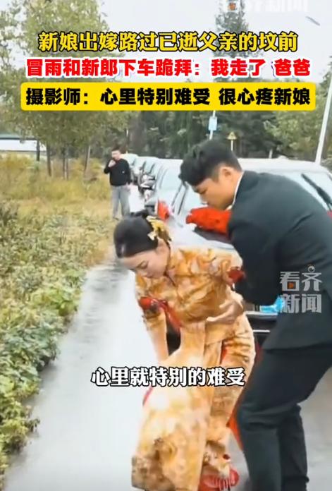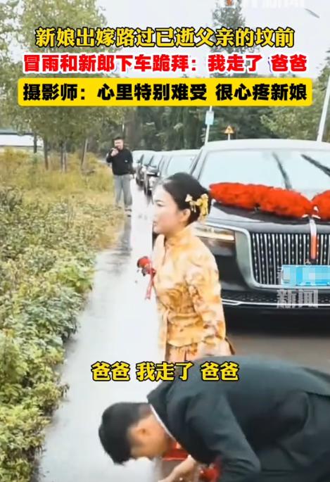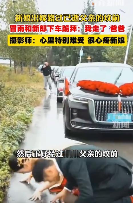 ”这个新娘火到人民日报!“近日,江苏徐州,新娘出嫁途中大喊停车,从车上下来跪在了地上……而她说的一句话,让在场的人都泪目了!网友:这新娘是个好媳妇,结婚没有嫌弃地上脏,直接跪上去。一般人做不到,值得被善待! 接亲车队刚转过村口,村里人早早听见鞭炮声,都出来看热闹。 婚车上坐着的新娘,穿着一身秀禾,手里捧着花,又紧张又开心。 副驾前的玻璃上还贴着个大红“囍”字。 她正和身边的伴娘聊着待会儿拜堂的流程,想着新生活要开始了。 路过一片空地时新娘喊道:“师傅,停一下!快停车!”她声音一下拔高,语气里带着急。 司机被吓了一跳,还以为车出问题,连忙踩刹车,把车靠边停好。 后面几辆婚车也跟着一排排停下,喇叭声、笑声一下子都没了,只剩风从田埂那边吹过。 伴郎伴娘们探着头往外看,满脸疑惑:“咋了?出啥事了?” 还没等他们反应过来,新娘已经一把解开安全带,拉开车门冲了下去,秀禾的裙摆扫过地面,带起一阵灰。 她一边跑一边抬头张望,脸上全是紧张。那一刻,所有人都愣在原地,不知道这新娘到底看到了什么。 她几步跑到路边的空地,突然“扑通”一声跪了下来。 周围瞬间安静。 刚才还热闹的接亲队伍,此刻只剩风声。 新娘新郎跪在那,双肩微微颤抖,她哽咽着说:“爸爸,我走了爸爸!” 这话一出,旁边的人全明白了。离车不远的地方,是她父亲的坟。 老人生前最惦记的,就是能亲眼看着女儿出嫁,可命没等人。 伴娘和亲友都红了眼,可没人出声打断。 新娘哭得几乎站不起来,新郎扶着新娘站起来,新娘抬头看着他,泪流满面,却伸手紧紧握住了他的手。 这一幕,让在场所有人都忍不住掉泪。 其实,这条路是新郎特意选的,他知道新娘心里一直放不下父亲,特意让婚车绕过这里,好让她能“跟爸说一声再见”。 他没想到她会当场下跪,但那一跪,跪出了所有的思念。 后来婚礼照常举行,时间没耽误太久。 上车时,新娘的裙摆沾满泥点,可她的脸上却多了一份平静。 那天的视频传上网,不少人都被触动。 有人说:“这姑娘真孝顺,穿着婚纱也要给父亲磕头,不顾脏不怕疼。” 也有人夸新郎:“这样的男人才靠谱,能懂得她心里的痛。” 还有人留言:“我结婚那天也路过爸的墓地,却没敢停车,现在看到这姑娘,真后悔。” 有时候,婚礼上最打动人的不是誓言,而是这些不经意的瞬间。 新娘那一跪,是女儿对父亲最后的问候,新郎的那一跪,是男人对爱的承诺。 人这一辈子,总有些话说不出口,总有些人等不到。 趁还来得及,好好珍惜眼前的人。 对此你怎么看? 信源:看齐新闻