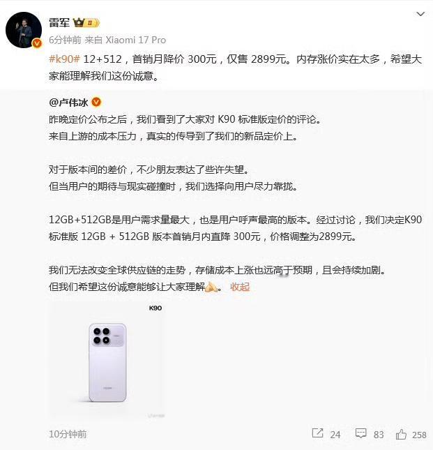 今天上午雷军微博回应了K90定价争议,直接给12+512版本降了300。 表面看是用户赢了,但仔细想想,这事真没那么简单。 内存价格暴涨170%是事实,美国关税加到125%也是事实,可偏偏小米敢逆势降价。 有人夸这是用户导向,可发布会当初为啥不直接定2899?非要等骂声起来了才改,这营销套路是不是太明显了。 不过话说回来,2899能买到骁龙8 Elite和7100mAh电池,性价比确实还是踩死了底线。 现在看,这波操作既赚了口碑又清了库存。 但真正值得琢磨的是,当整个行业都在涨价缩配时,有人愿意为用户体验退一步,哪怕只是小退一步,也足够让同行冒冷汗了。 供应链寒冬里,这种笨功夫反而成了最聪明的打法。
