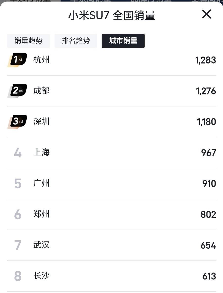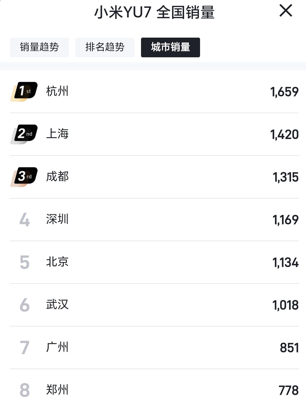 9月小米汽车城市销量榜前5名 1:杭州,9月小米汽车杭州销量2942辆其中小米YU7卖了1659辆。 2:成都,9月小米汽车成都销量2591辆其中小米YU7卖了1315辆。 3:上海,9月小米汽车杭州销量2387辆其中小米YU7卖了1420辆。 4:深圳,9月小米汽车成都销量辆其中小米YU7卖了2347辆 5:广州,9月小米汽车成都销量2591辆其中小米YU7卖了1761辆。 小米汽车都卖到哪去了 小米目前只有两款车,这两款车刚上市就引爆市场,9月小米SU7是销量最高的中大型轿车,而小米YU7则是销量最高的中大型SUV。 第一辆车汽车正式上市仅一年半,两款车月交付超过4万辆,这个速度是造车新势力里最快的。 通过城市销量来看,杭州人最喜欢小米汽车。或许你会抬杠,但小米汽车就是目前最成功的造车新势力之一,也是未来存活率最高的新势力品牌。