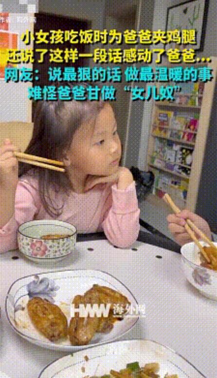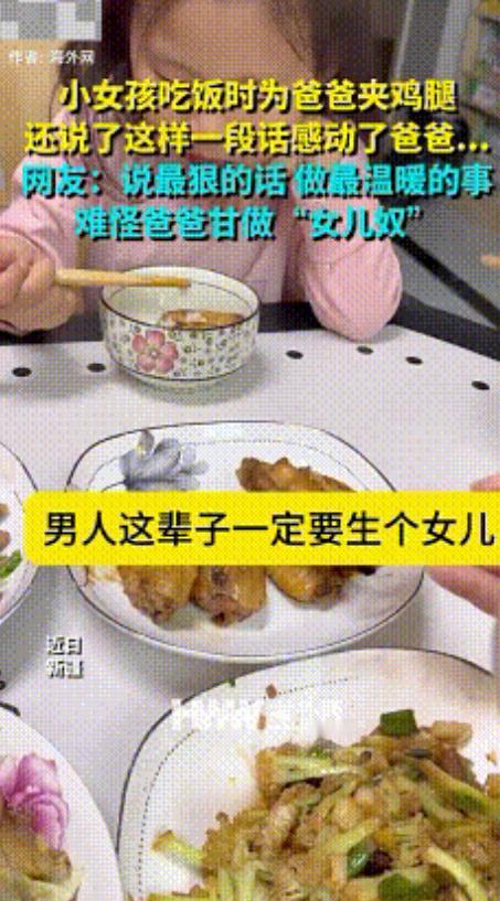 泪目了!新疆,一小女孩吃饭时给没有夹鸡腿的爸爸夹了一个后,在妈妈质疑话语中,说了一段话瞬间感动爸爸。小女孩:你觉得我们没有吃好,爸爸会夹吗?网友:说最狠的话 做最温暖的事,难怪爸爸甘做“女儿奴”。 李先生(化名)忙了一整天,他推开家门,屋里传来饭菜的香味,瞬间让他一身的疲惫感减轻了不少。 女儿也赶紧冲过去抱着他,妻子在厨房忙碌了半天,桌上已经摆好了丰盛的一餐。 李先生洗了把手,顺手倒了一杯酒,微微抿了一口,暖意顺着喉咙缓缓流下,让他整个人都放松下来。 女儿看着妈妈刚给碗里夹了几口菜,又给哥哥夹了个鸡腿。 她凑过去,也用小小的筷子小心翼翼地从盘中夹起鸡腿。 握着筷子,动作小心而费力,每一夹都像是在算计如何不弄掉。 妈妈看着碗里仍然剩下鸡腿的女儿,语气带着些严肃:“小桃,你碗里也有,先吃完碗里的再夹。”小女孩抬头看了妈妈一眼,眼神里透着坚定和一丝暖意,轻轻说道:“我是想给爸爸夹。” 妈妈的眉头微微一挑,又严肃地补充道:“谁吃谁夹。” 小女孩没被吓住,她先把没夹稳的鸡腿小心放回盘里,再重新夹起来,动作慢但非常认真,稚嫩的声音带着耐心和思考:“嗯,你觉得我们没吃好,爸爸会夹吗?” 她说话的间隙,眼睛盯着盘子,好像在计划下一步的“行动”。 妈妈静静地看着女儿,小桃专注的神情和认真夹鸡腿的动作让她有些愣住,心里一股暖流缓缓流动,她不再多言,只是默默观察女儿的每一个动作。 李先生正端着杯子,生怕不小心碰到女儿,这时却看到小桃小心翼翼地将鸡腿放进他的碗中。那一刻,他的眼眶有些湿润,感激地看着女儿。 小桃听到爸爸回应,微微皱了皱小眉头,不太相信,仍然认真地把鸡腿放稳在碗里,然后坚定而稚嫩地喊了一声:“刀。” 李先生听到女儿说的老家方言,忍不住笑出声来,眼里满是柔情。 李先生(化名)看着小女儿小桃这么贴心、认真,心里涌起一股暖流。 他端起面前的酒杯,酒液在灯光下微微晃动,散发着淡淡的香气。 他一口饮尽杯中酒,喉咙被温热的酒液轻轻冲刷,微微泛起一丝暖意,也像是把一天的疲惫都带走了一半。 脸上笑意不减,他眼角带着些许湿润,嘴角微微上扬,满是宠溺与感动。 看着小桃小心地把鸡腿递到自己碗里,他忍不住轻轻点了点头,眼神里满是鼓励和赞许。 即便是喝完酒,他也没有放下杯子,握着杯子的手稳稳的,像是用这个动作默默回应女儿的心意。 他的笑容温暖而自然,既带着父亲的慈爱,也夹杂着一丝心疼和欣慰。屋内的灯光映在他的脸上,映出平日少有的柔和轮廓,与小桃稚嫩、认真夹鸡腿的动作形成温馨的画面,让整个餐桌的氛围都格外柔软。 他又抿了一口酒,眼睛微微眯起,注视着女儿那份专注与小小坚持,心里暗暗想着:“这个孩子,真贴心,也真懂事。”整个动作虽平常,却因为情感的温度而格外动人。