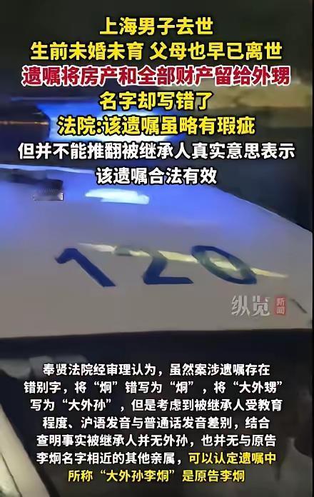 上海一桩遗产继承案最近引发热议:男子去世后姐姐们公证分了遗产,没想到外甥整理遗物时发现一封自书遗嘱,写明所有财产都留给自己,大姨却以“称谓错、名字错、时间错”为由不认账,最终外甥告上法院胜诉。这事儿从头到尾透着股亲情里的拧巴,也让大家看清了“法律讲证据,更讲情理”的道理。 故事里的张先生无妻无子,父母早逝,只剩两个姐姐和二姐的儿子李某(也就是他的大外甥)最亲。平日里张先生身体不好,尤其是生病出院那段时间,全靠大外甥李某忙前忙后照顾,端水喂药、跑医院缴费,这份陪伴成了他晚年最暖的依靠。2022年5月,张先生走了,两个姐姐操办完丧事,想着弟弟没后人,自己是第二顺位法定继承人,就拿着材料去公证处做了继承公证,把弟弟的部分遗产给分了,压根没想着问问常来照顾的外甥。 谁知道一年不到,2023年3月,李某整理舅舅遗物时,在旧书柜的夹层里翻出了一封泛黄的信——竟是舅舅亲笔写的自书遗嘱!上面清清楚楚写着,要把名下房子、银行存款、股票甚至珍藏的邮票,全交给“大外孙李烔”,落款是“二0二年四月五日”。李某看着信鼻子一酸,舅舅生前总说“你比亲儿子还亲”,没想到真把身后事全托付给了自己。 可找大姨张大姐商量时,对方却泼了盆冷水:“遗嘱写的是‘大外孙’,你是外甥,差着辈呢!名字也不对,你叫李炯,这儿写的是‘烔’,多一横!时间还只写‘二0二年’,哪年的都不知道,这遗嘱根本无效!”更揪着《民法典》里“受遗赠人要在60天内明确表示接受”的规定不放,说李某没法证明自己在期限内表过态。 协商不成,李某只能一纸诉状把大姨告到法院。这案子的关键,其实就是这份“漏洞百出”的遗嘱到底算不算数。法院审理时倒是看得通透:张先生一辈子没孩子,哪来的“外孙”?再加上上海话里“外甥”“外孙”发音相近,老人年纪大了笔误很正常;至于名字,“炯”和“烔”就差一横,亲戚里也没第二个人叫这名字,明眼人都知道指的是谁;时间虽然没写全,但结合张先生2020年才办的房产证,能推断遗嘱是2020年后写的,而且没有其他遗嘱冲突,不至于分不清。 更重要的是,李某拿出了2023年3月11日发现遗嘱后,两天内就通过母亲告知两位姨妈“愿意接受遗赠”的聊天记录,完全没超过60天的法定期限。最终法院判了李某胜诉,说遗嘱虽有瑕疵,但“把遗产给大外甥李炯”的意思很明确,具有法律效力,还驳回了张大姐的上诉。 说到底,这案子赢在“情理之中”。张先生用不太规整的文字,写的是对真心照顾自己的外甥的认可;法院没有死抠字眼,而是结合老人的实际情况、亲属关系和日常相处来判断,这才没让“好心照顾人”的外甥寒了心。反观两位姐姐,只想着法定继承的“理”,却忽略了弟弟生前的“情”,最后不仅要退还遗产,还伤了亲情,实在不值当。这也给大家提了个醒:遗产继承从来不是简单的“按规矩来”,那些藏在文字背后的真心和陪伴,才是最该被看见的东西。