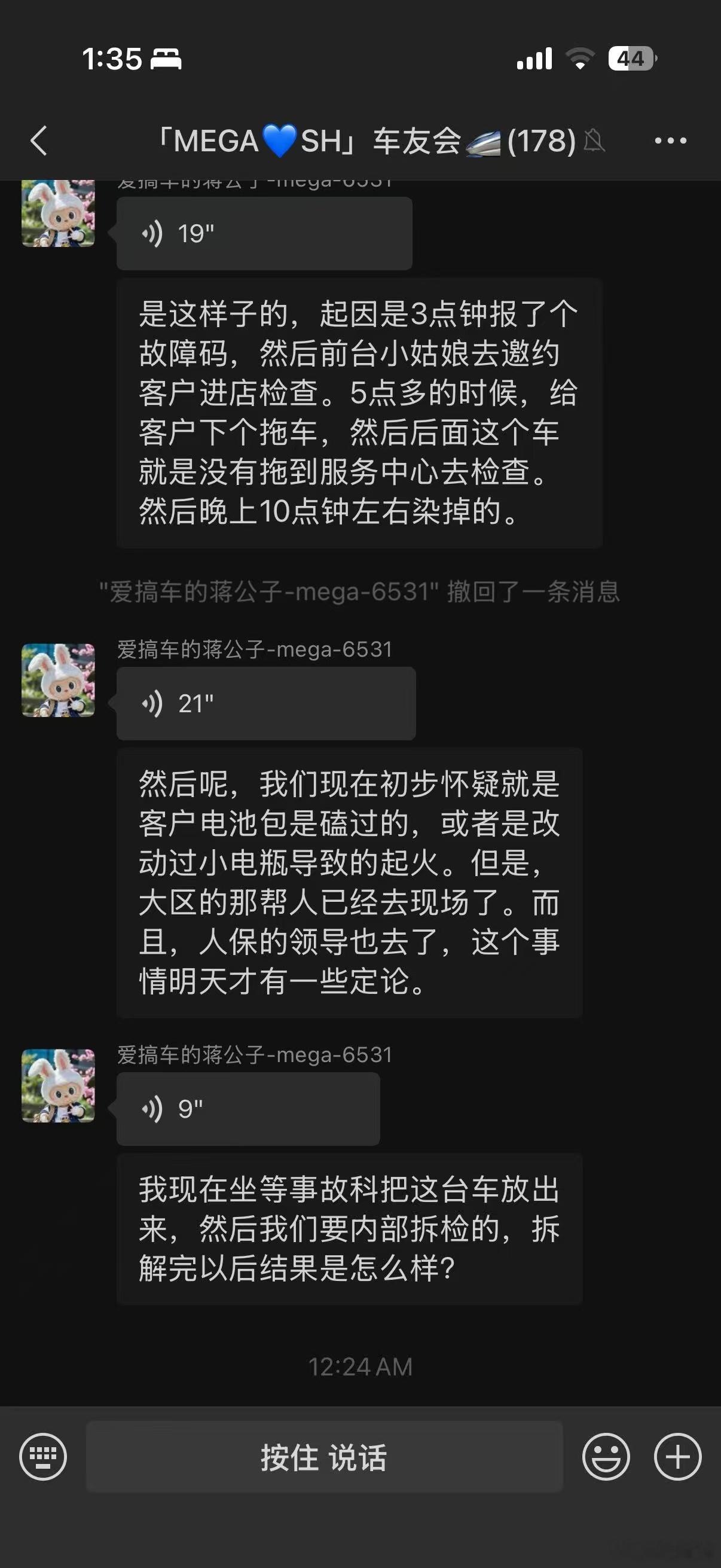 MEGA起火个事情,已经出现了一个“反转”,很多群里流传着一段微信对话,说是后台早些时候已经收到故障码,怀疑电池包被磕碰,但车主没管,继续硬开,最后出现晚上起火那一幕。
