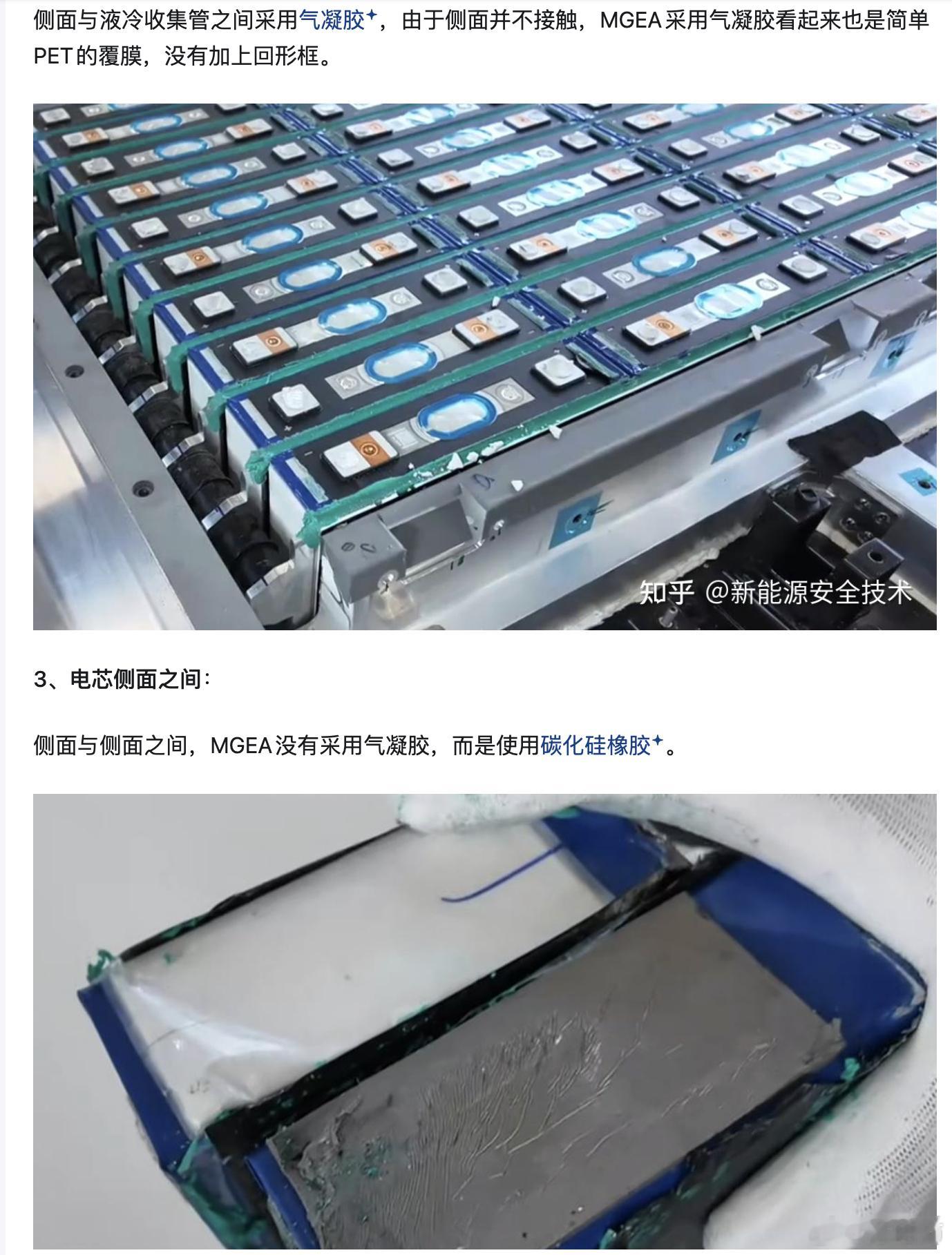 然后我查了一下,这台车用的麒麟电池包是有做热失控防范的,除了远程监控和铝合金水冷板这些预防性措施外,也做了保底的绝缘隔热设计,具体是电芯之间用了简单的气凝胶,侧面用比较厚的碳化硅橡胶。