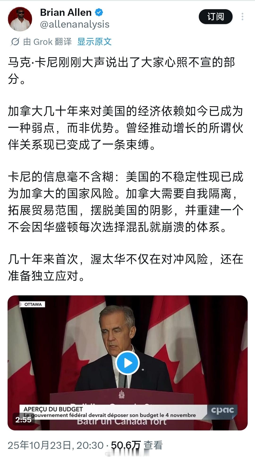 加拿大总理马克·卡尼昨天刚说要“摆脱对美国的经济依赖”,卡尼称加拿大需要自我隔离,拓展贸易范围,摆脱美国的阴影,发展“加拿大制造”。