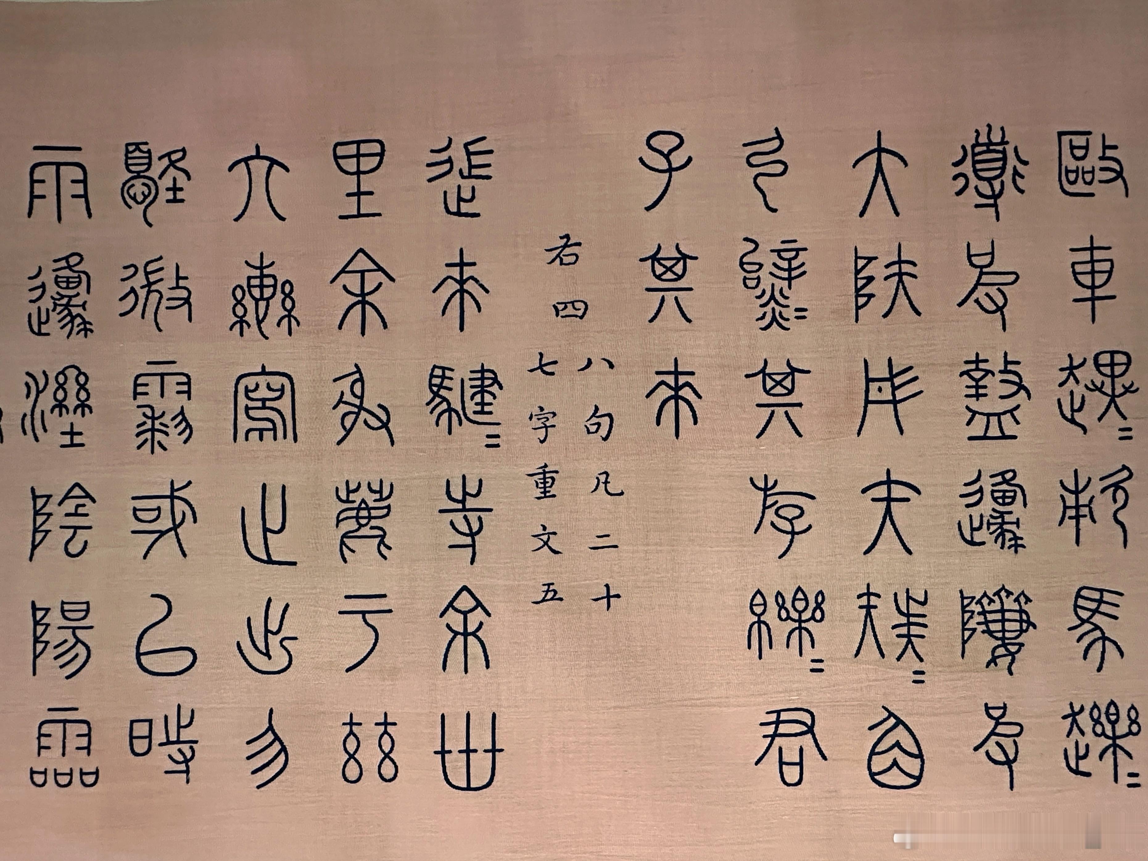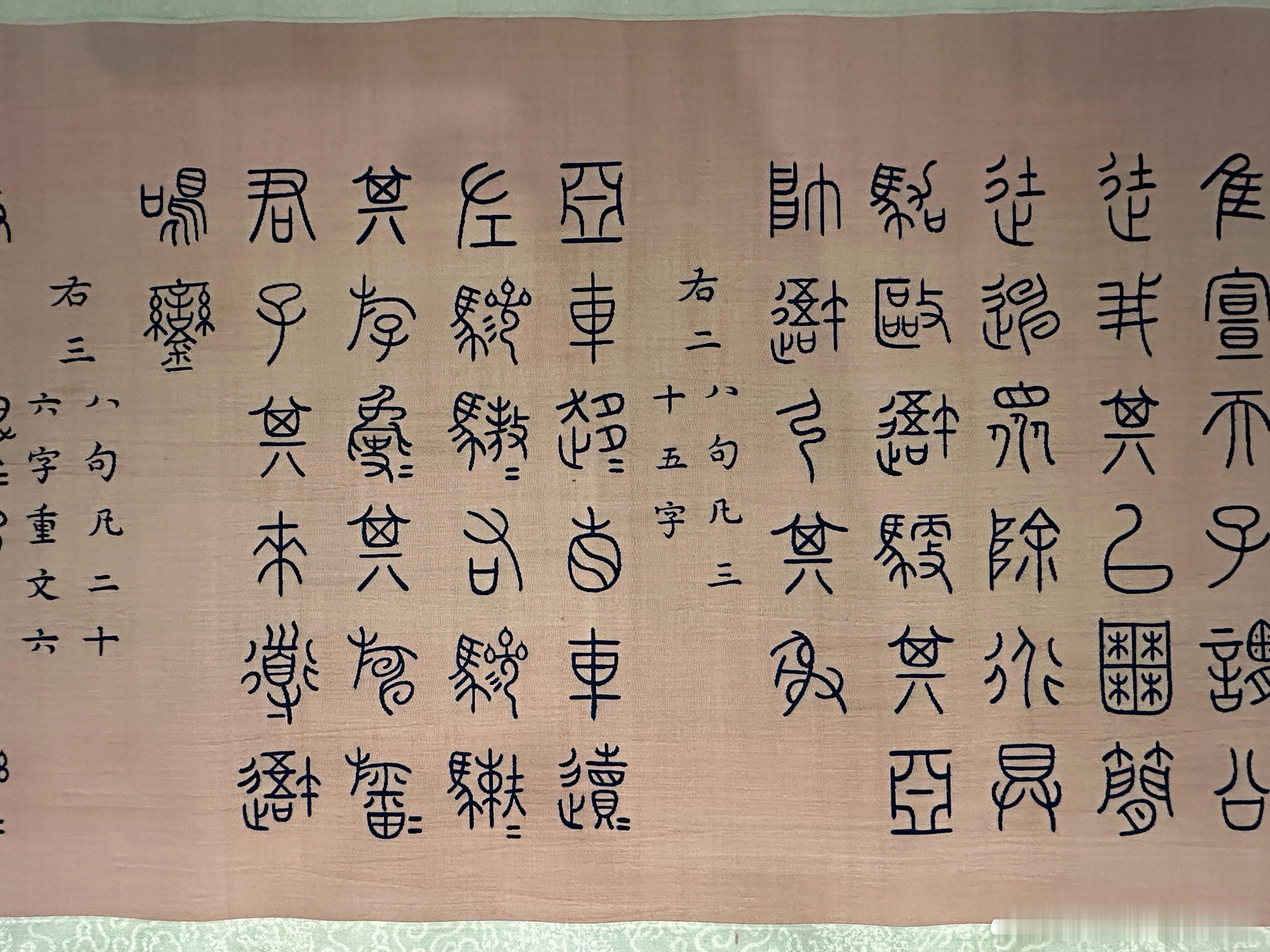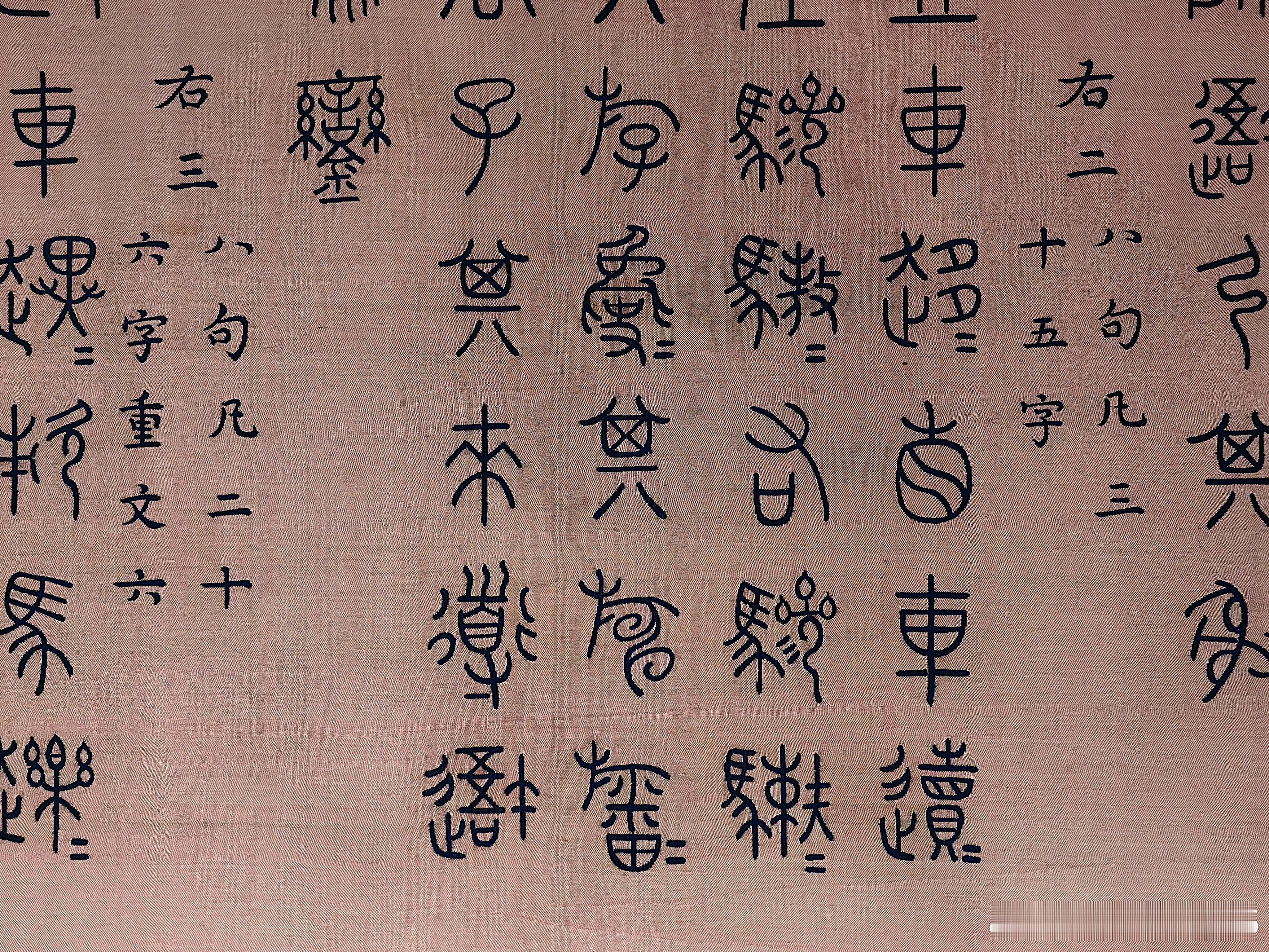 此缂丝手卷是根据重华宫所藏《御笔重排石鼓文并再题石鼓诗》织成。乾隆五十四年,乾隆筹备重刻石鼓事宜并颁《集石鼓所有文成十章,制鼓重刻序》,引首御题大字“文存石寿”,后依次为“集石鼓所有文成十章 制鼓重刻序”及“集石鼓所有文十章”等。手卷装潢用彩云金龙纹缂丝料,放置于特制的雕云龙纹紫檀匣内。