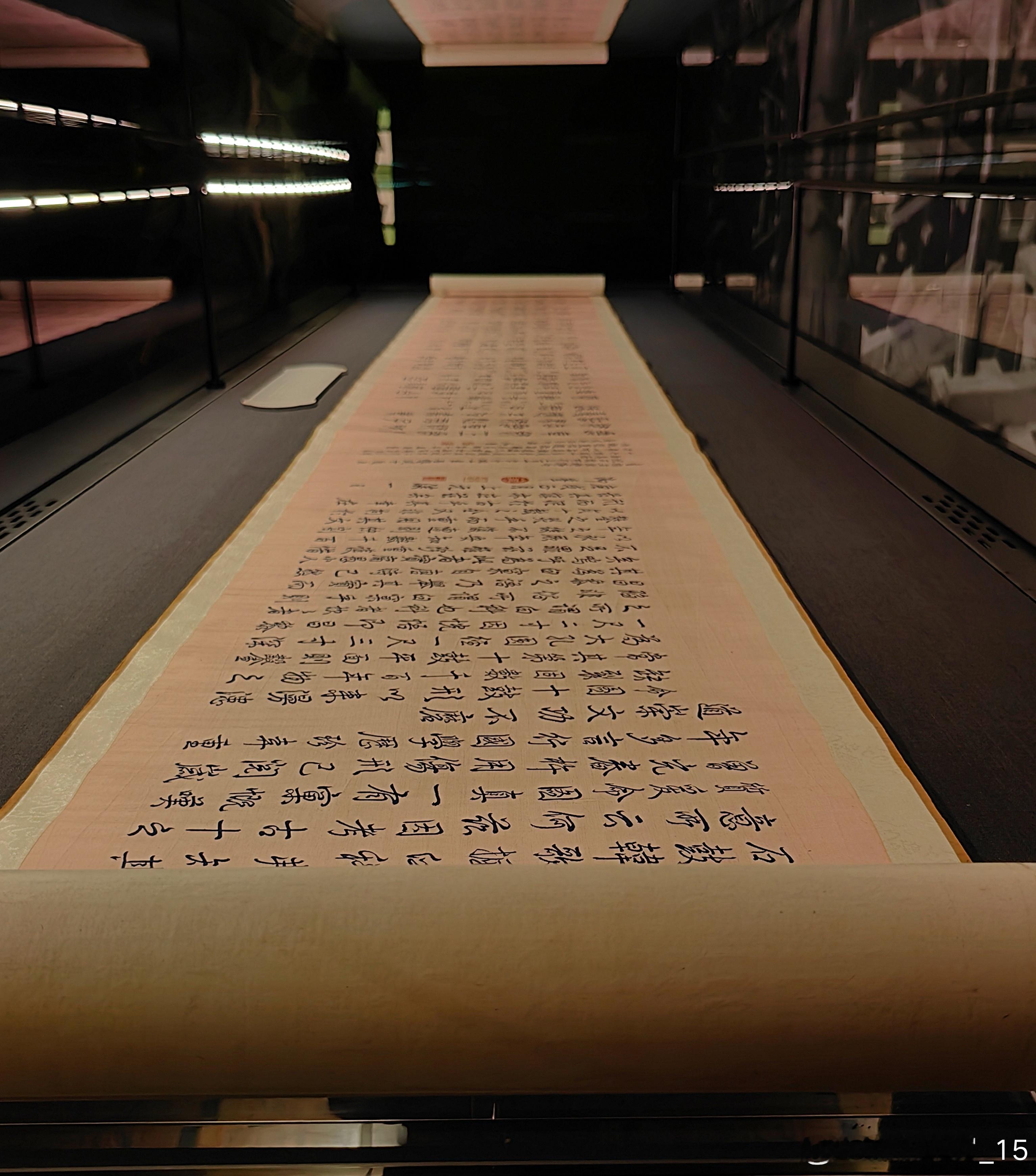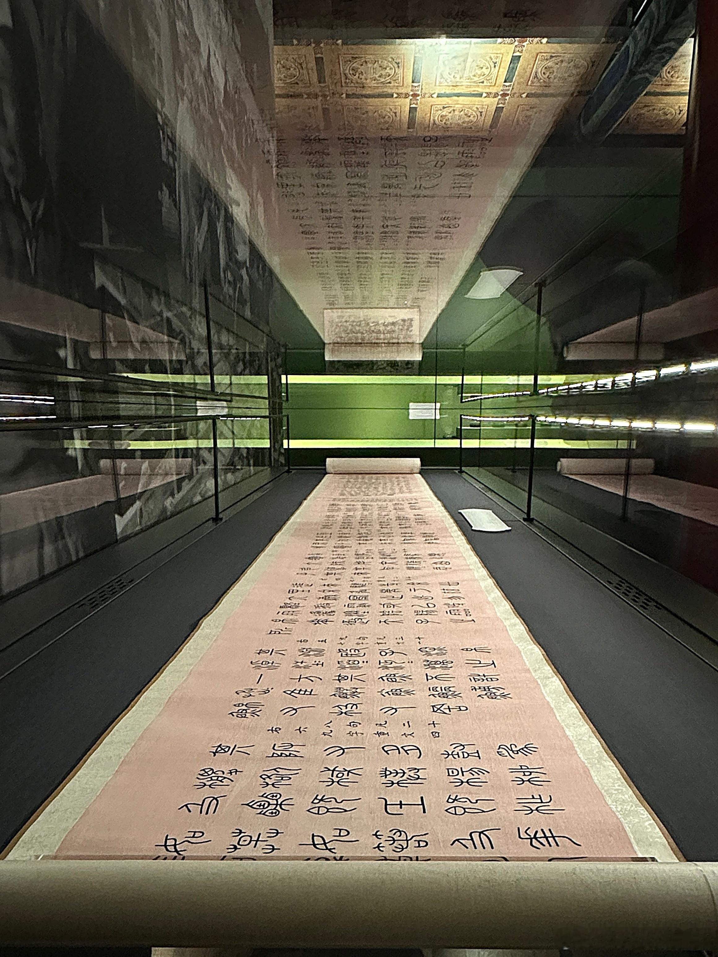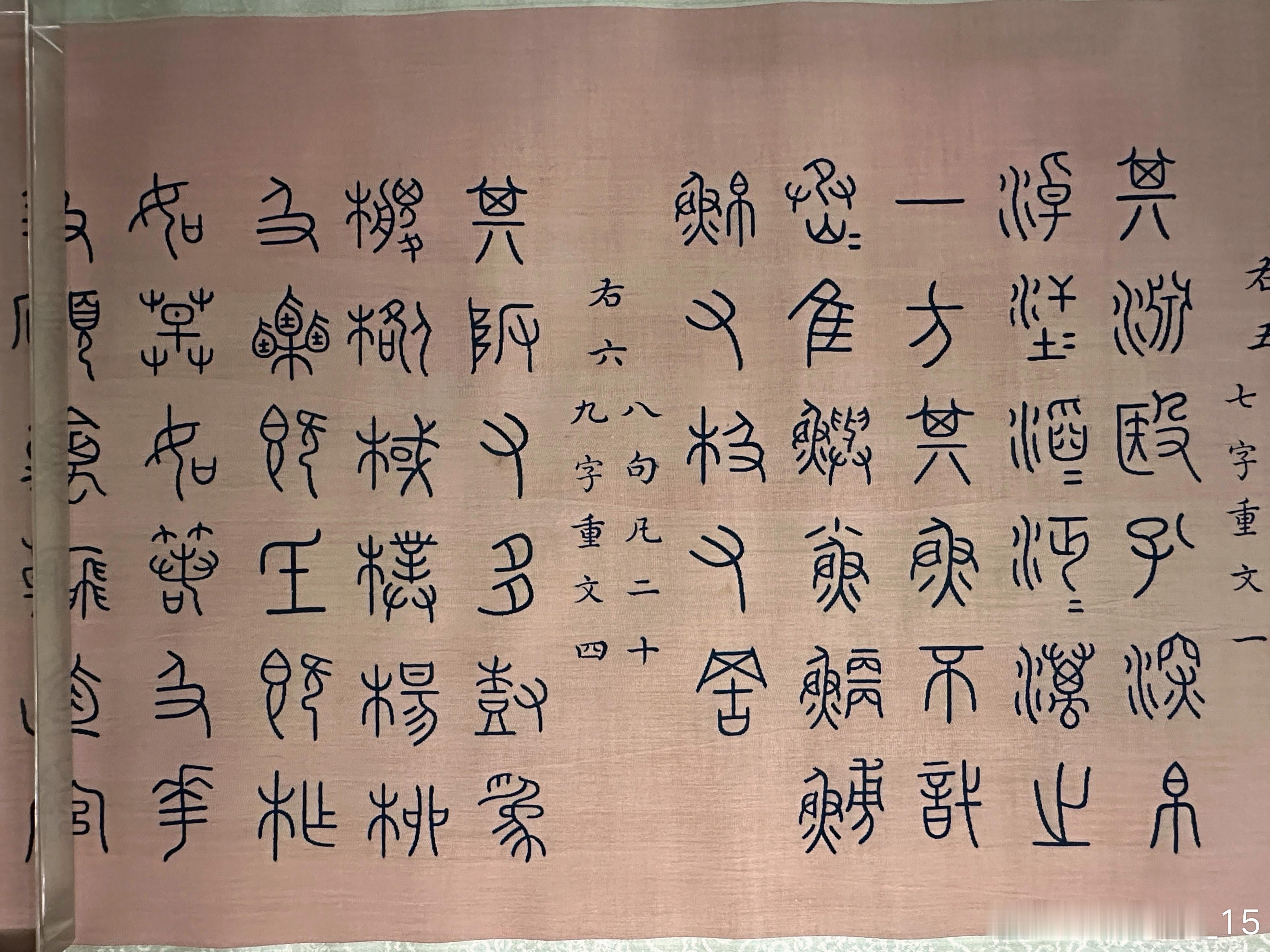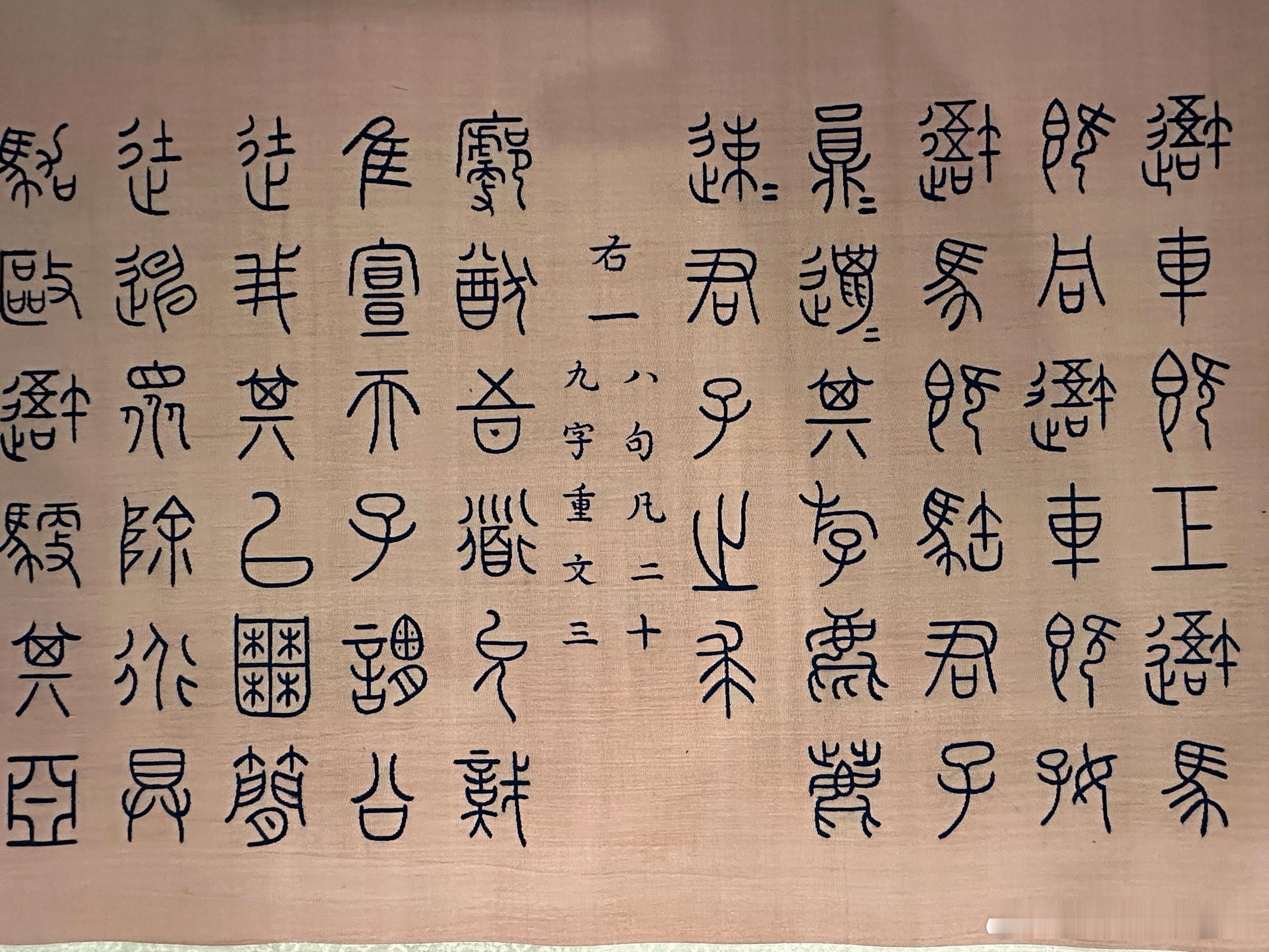 此缂丝手卷是根据重华宫所藏《御笔重排石鼓文并再题石鼓诗》织成。乾隆五十四年,乾隆筹备重刻石鼓事宜并颁《集石鼓所有文成十章,制鼓重刻序》,引首御题大字“文存石寿”,后依次为“集石鼓所有文成十章 制鼓重刻序”及“集石鼓所有文十章”等。手卷装潢用彩云金龙纹缂丝料,放置于特制的雕云龙纹紫檀匣内。