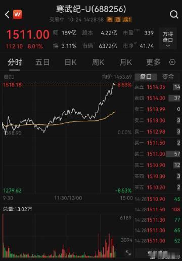 【芯片股持续走高 寒武纪股价重回1500元】10月24日,午后芯片股持续走高,算力芯片龙头寒武纪涨超7%,重返1500元上方,神工股份、华虹公司、拓荆科技均涨超10%、伟测科技、长川科技、中微公司、中芯国际等跟涨。