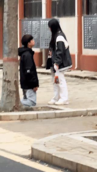 街头拍到的奇葩一幕。 一名男孩竟然在马路边向一名女孩下跪乞求女孩的原谅? 虽然不清楚究竟是什么原因让男孩这么做? 但是如果让男孩的父母看见自己的儿子向别人下跪? 也不知道他们会作何感响?