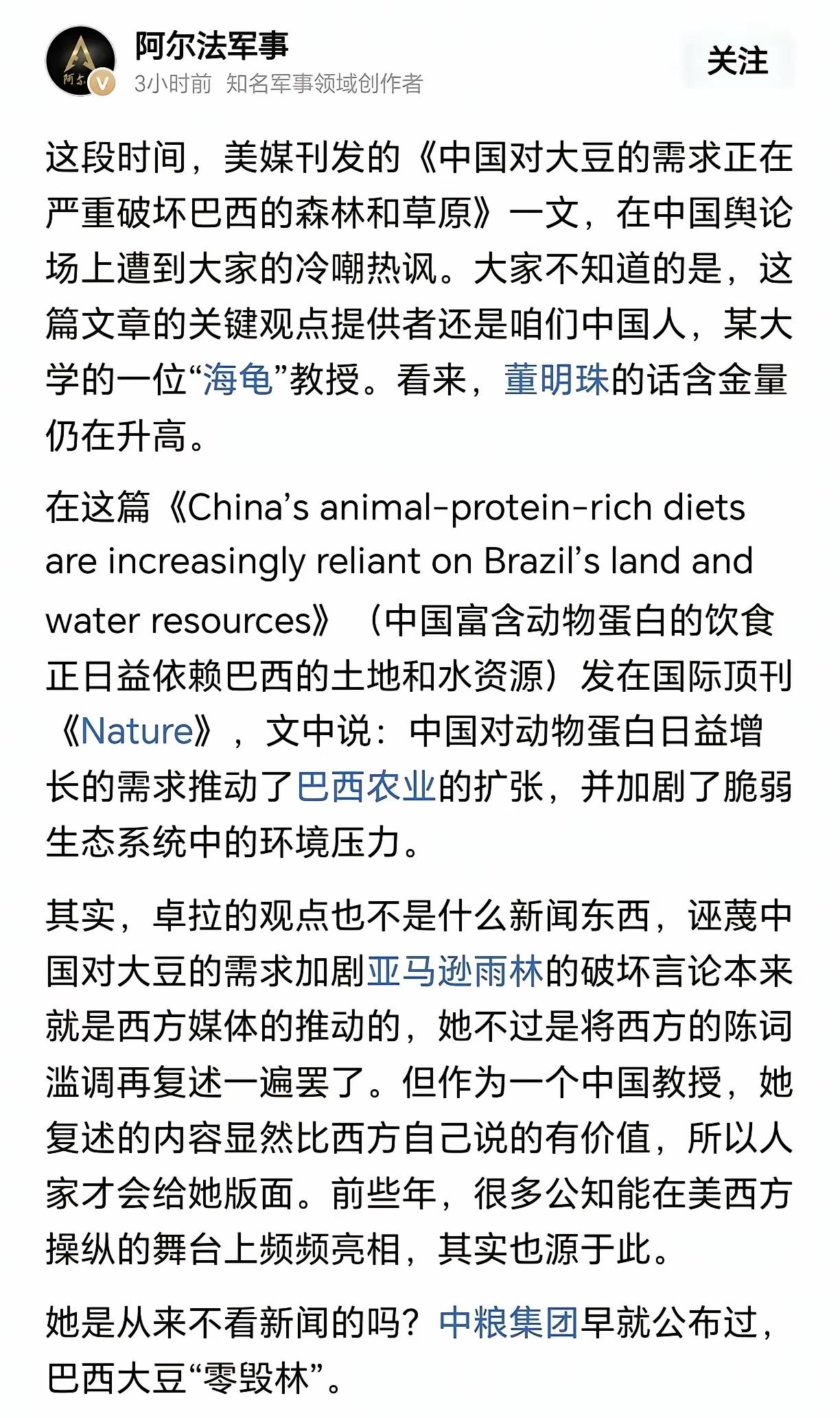 西北农林科技大学海龟女博士的论文:中国买巴西大豆正在毁掉热带雨林。 说来说去,最终还不是一句话:中国必须买美国大豆。 话说巴西砍不砍热带雨林,和中国买谁的大豆有什么关系?真不明白这些高校教师,屁股到底坐在哪一边呢? 看来我国禁止买美国大豆,真的让美国感到疼了。