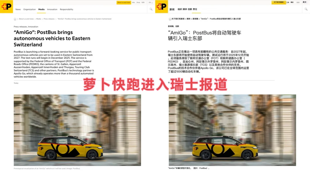 关注萝卜快跑很久了,继9月落地迪拜之后,昨天又宣布与瑞士邮政旗下PostBus达成合作,在瑞士东部三州——圣加仑州、外阿彭策尔州与内阿彭策尔州,推出无人驾驶服务“AmiGo”。预计于今年12月启动测试,2026年上半年选定用户运营,最晚于2027年第一季度常规化服务。