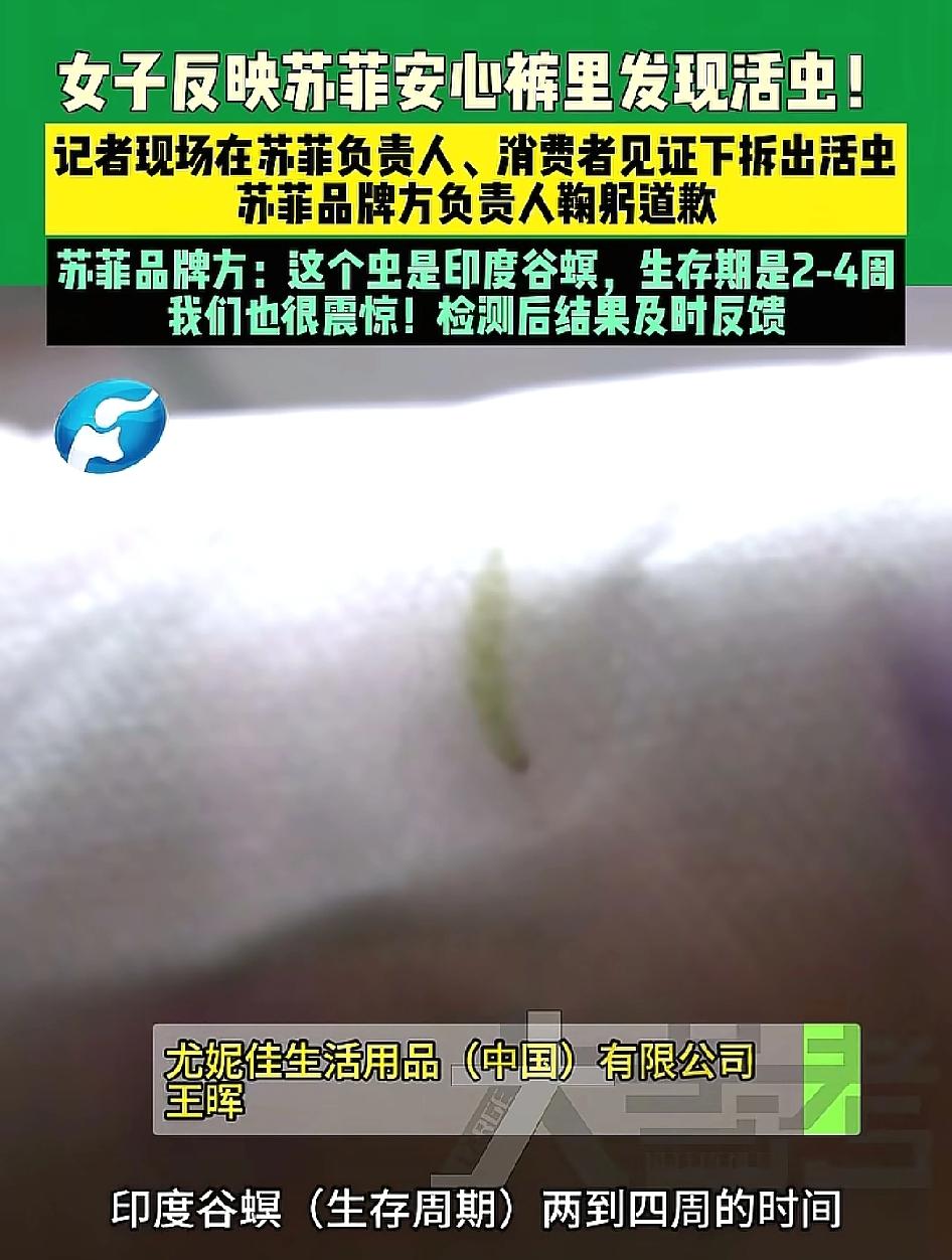 13岁女孩用苏菲安睡裤后感染霉菌!现场拆封出现活虫,品牌鞠躬道歉。 女孩使用苏菲安心裤后身体不适,就医查出霉菌感染!家长联系记者找到苏菲厂家,视频中现场拆封同款产品,发现有活虫蠕动,经确认虫类为生存期2-4周的印度谷螟。 面对质疑,苏菲品牌方负责人当场鞠躬道歉。厂家称工厂采用自动化封闭生产,推测虫卵或源于运输、存储环节,目前正追查具体问题环节,检测结果将及时反馈。 此外,厂家已明确表示,将与家长协商解决孩子的治疗费用问题。
