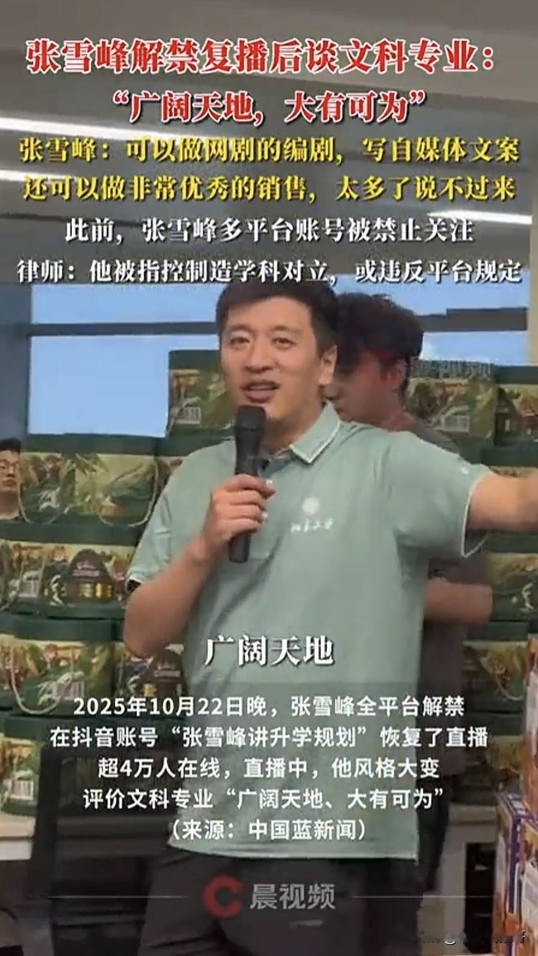 张雪峰的解封告诉我们一个道理 做人首先要做到识时务者为俊杰 做事要明白凡事要适可而止。以前他鼓励大家选所谓好就业的专业,就像鼓励姑娘都嫁高富帅,会制造矛盾和供需失衡。所有人都去追求少数好就业的专业,准入门槛就被抬高了。其实本质上没有最好的专业,只有最合适的专业,不同的时代环境下,不同的专业优势劣势不同而已。