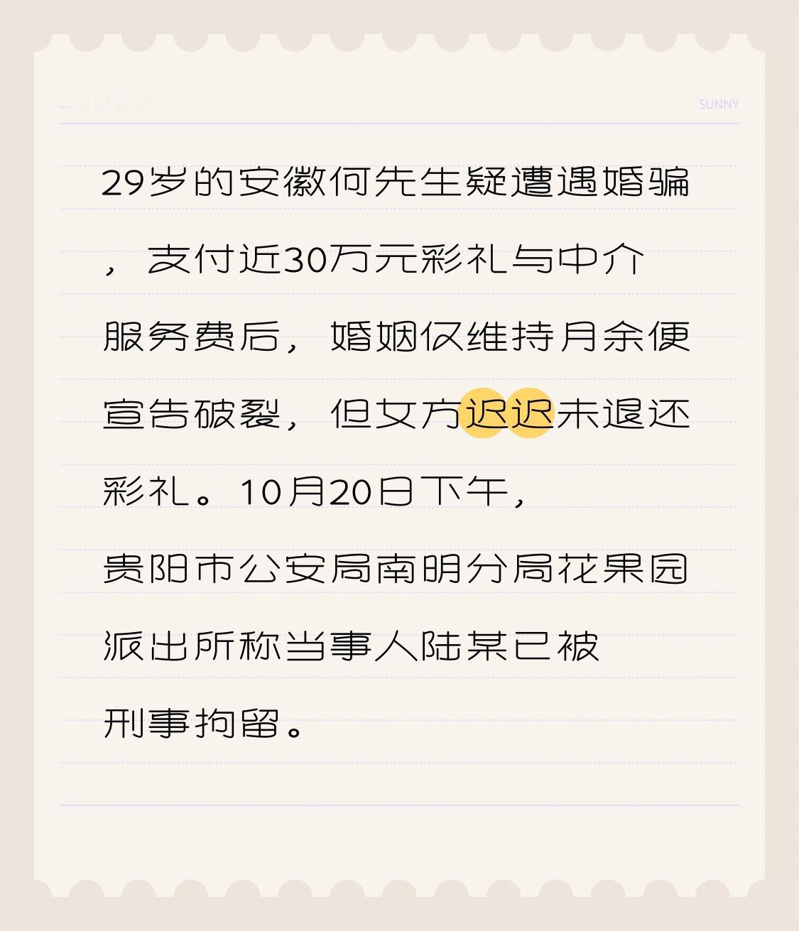 29岁的安徽何先生仿佛陷入了一场婚姻“陷阱”,疑似遭遇婚骗。他掏出近30万元彩礼和中介服务费,本以为开启了幸福婚姻的大门,没想到这婚姻就像一场短暂的烟花表演,仅仅维持了一个来月就“砰”地一声宣告散场。更可气的是,女方像个耍赖的“貔貅”,只进不出,迟迟不肯退还彩礼。 10月20日下午,贵阳市公安局南明分局花果园派出所传来消息,当事人陆某已被刑事拘留。