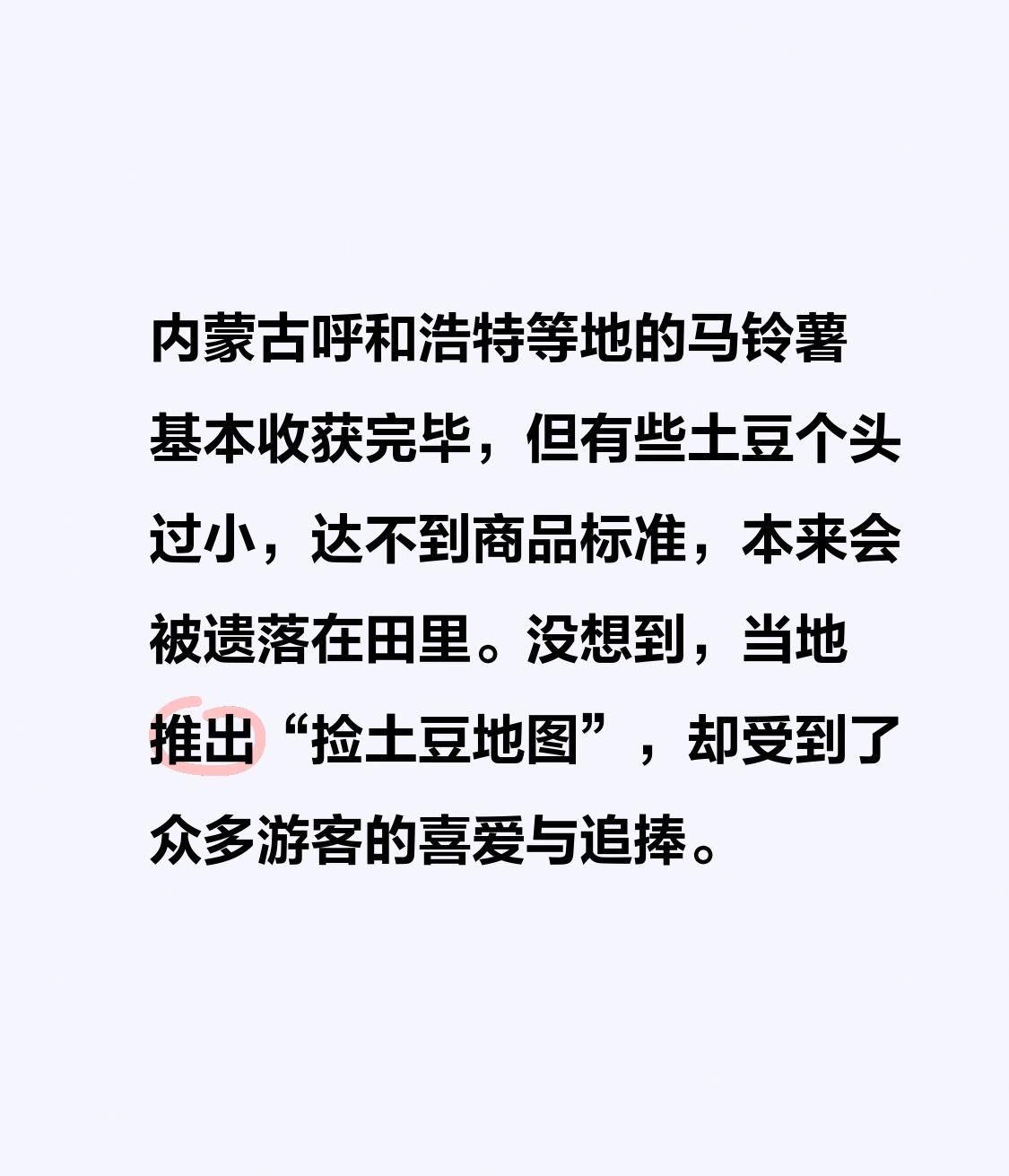 内蒙古呼和浩特等地的马铃薯基本都收完啦,就像一场盛大的“土豆大搬家”结束了。不过呢,有些土豆就像没发育好的“小不点”,个头太小,根本达不到商品标准,原本只能孤零零地被遗落在田里。谁能想到啊,当地搞出个“捡土豆地图”,这玩意儿就像一颗超级大的“吸铁石”,一下子吸引了众多游客,深受他们的喜爱与追捧。
