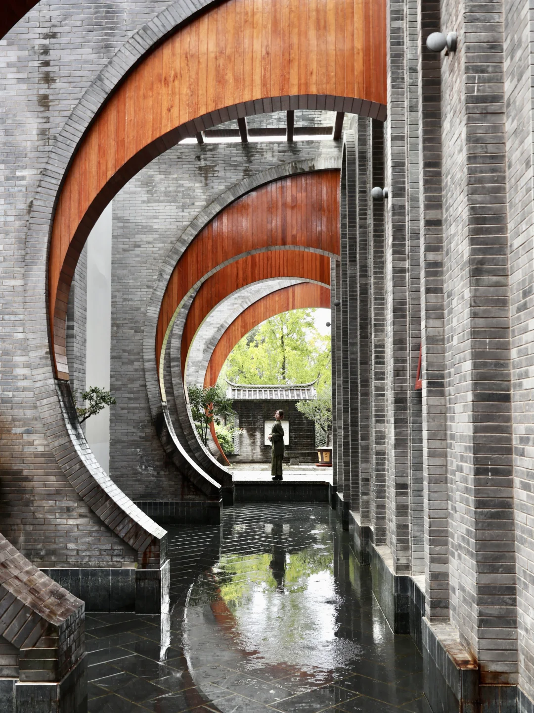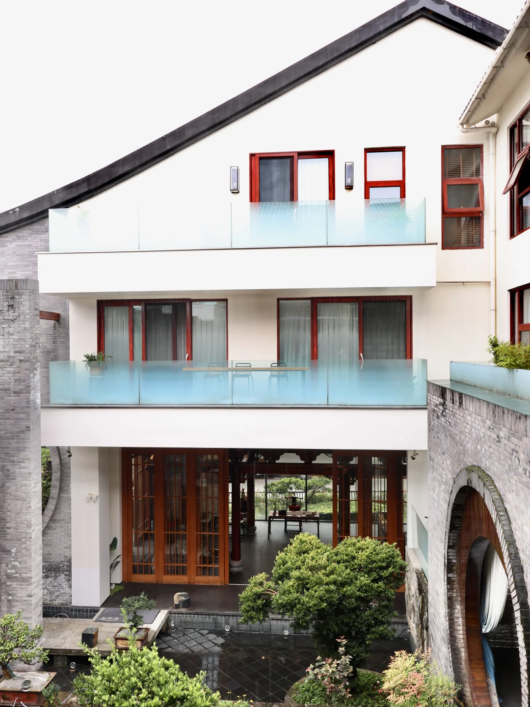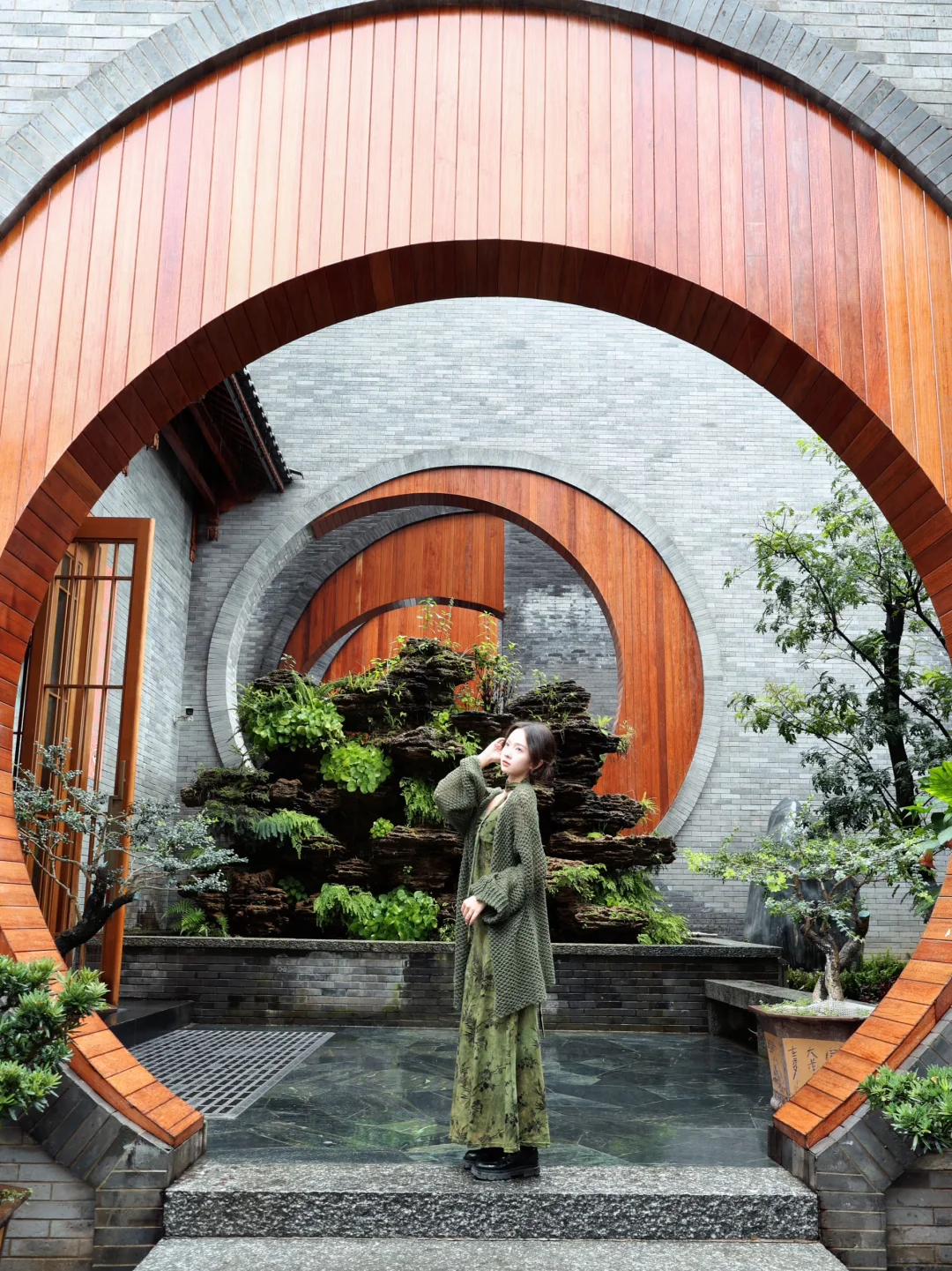 酒店是中式风格,飞檐翘角、雕梁画栋