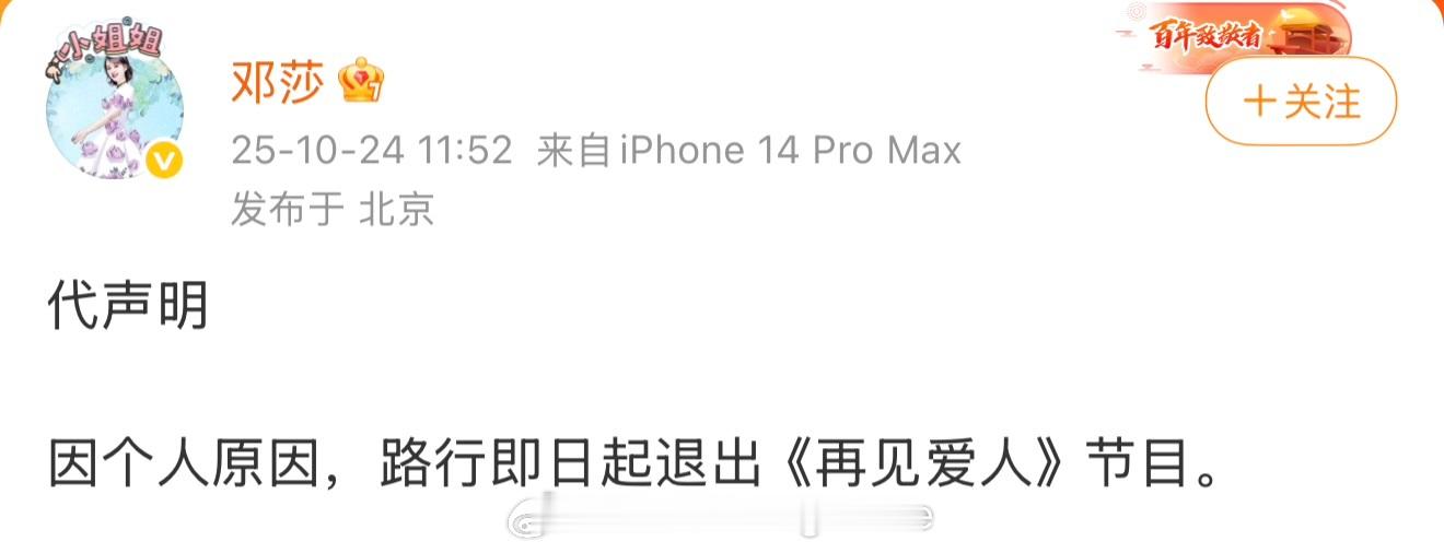 《再见爱人5》昨天宣布第二期延期上线,今天又恢复了播出,邓莎代发声明称因个人原因路行退出再见爱人5。恢复播出的第二期片头邓莎路行被删,镜头只剩下中插广告了,节目时长也从第一期上的两个小时删减到了40分钟。 邓莎一个人再见什么爱人
