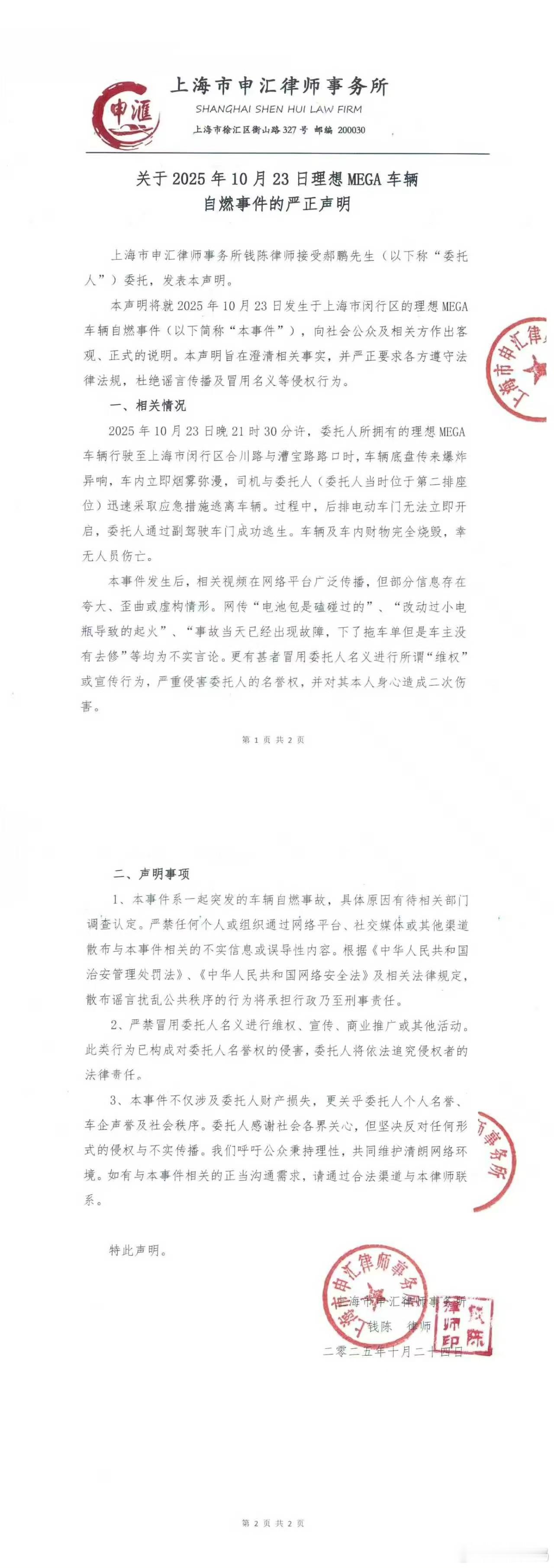2025年10月23日晚上起火的理想MEGA车主发律师函了,辟谣网传不实信息⬇️