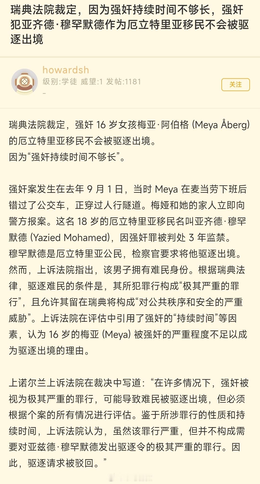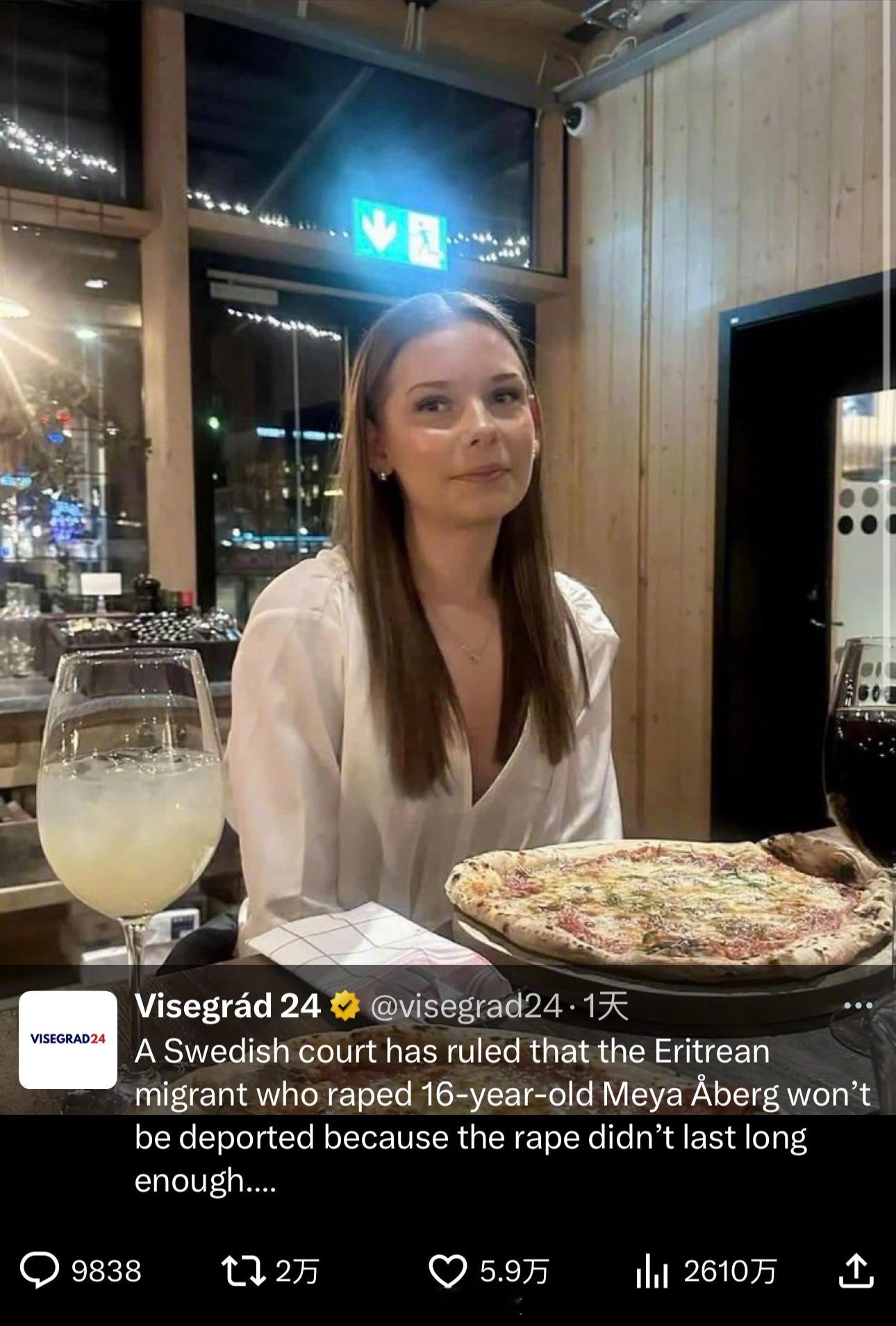 瑞典法院裁定,强奸 16 岁女孩梅亚·阿伯格(Meya Åberg) 的厄立特里亚移民不会被驱逐出境。因为“强奸持续时间不够长”。