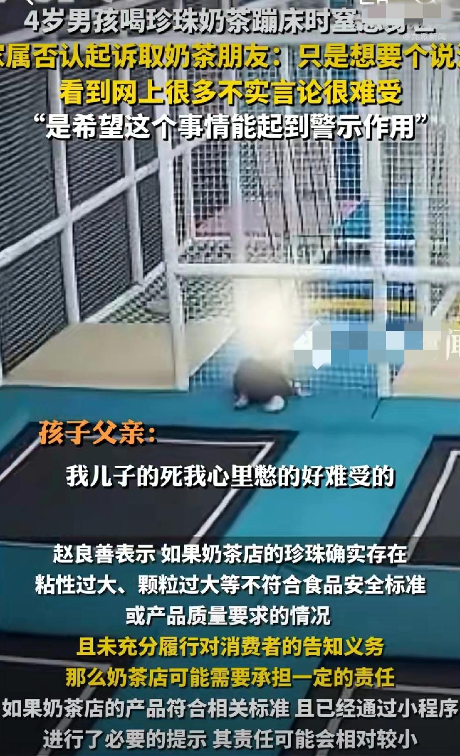 谁能想到,一杯常喝的珍珠奶茶,竟成了夺走孩子的“杀手”!浙江台州3岁男童在游乐场蹦床时,突然倒地窒息,抢救1个多小时还是没能救回来,医生从气管里取出的异物,正是奶茶里的珍珠 。 家属崩溃维权的视频让人揪心:他们把奶茶杯倒置,里面的珍珠粘得死死的掉不下来,质疑颗粒太大太黏不适合孩子吃,奶茶店没口头提醒,游乐场也没制止带食物入场 。可奶茶店说小程序早标了“三岁以下不宜食用,需监护饮用”,取餐的是大人也没见孩子 。现在镇政府和派出所都介入了,可好好的娃再也回不来了。 事一曝光,网友吵翻了:有人说家长不该让娃边蹦边喝,监护没到位;也有人骂商家警示太隐蔽,珍珠设计有风险。律师倒是说得实在:家长作为监护人责任最大,但要是珍珠真不符合安全标准、奶茶店没尽到告知义务,游乐场不会急救,各方都得担责 。 咱不聊谁对谁错,更该想怎么护住娃!医生反复强调,1岁以上孩子卡喉要立刻用海姆立克急救法,边救边打120。像珍珠、果冻、坚果这些小颗粒食物,给低龄娃吃要么弄碎,要么干脆别碰,更千万别让娃边跑边吃、边玩边吃。 珍珠奶茶窒息事件 家长监护那些事 儿童安全无小事 真心疼这家人!来评论区说说:你给娃买过带小料的饮品吗?家里人都学会海姆立克急救法了吗?还有哪些隐藏的育儿风险该警惕?