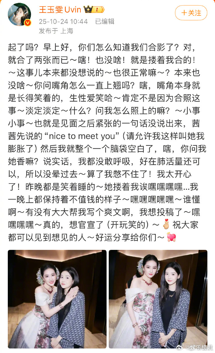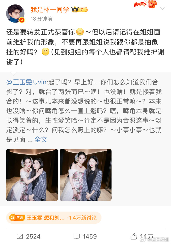 林一恭喜王玉雯王玉雯在vogue时尚盛典后台成功追星偶像刘亦菲并合影,好友林一通过幽默互动表达“酸意”和友情维护请求,你们的追星运我都想接!羡慕~vogue时尚之力盛会