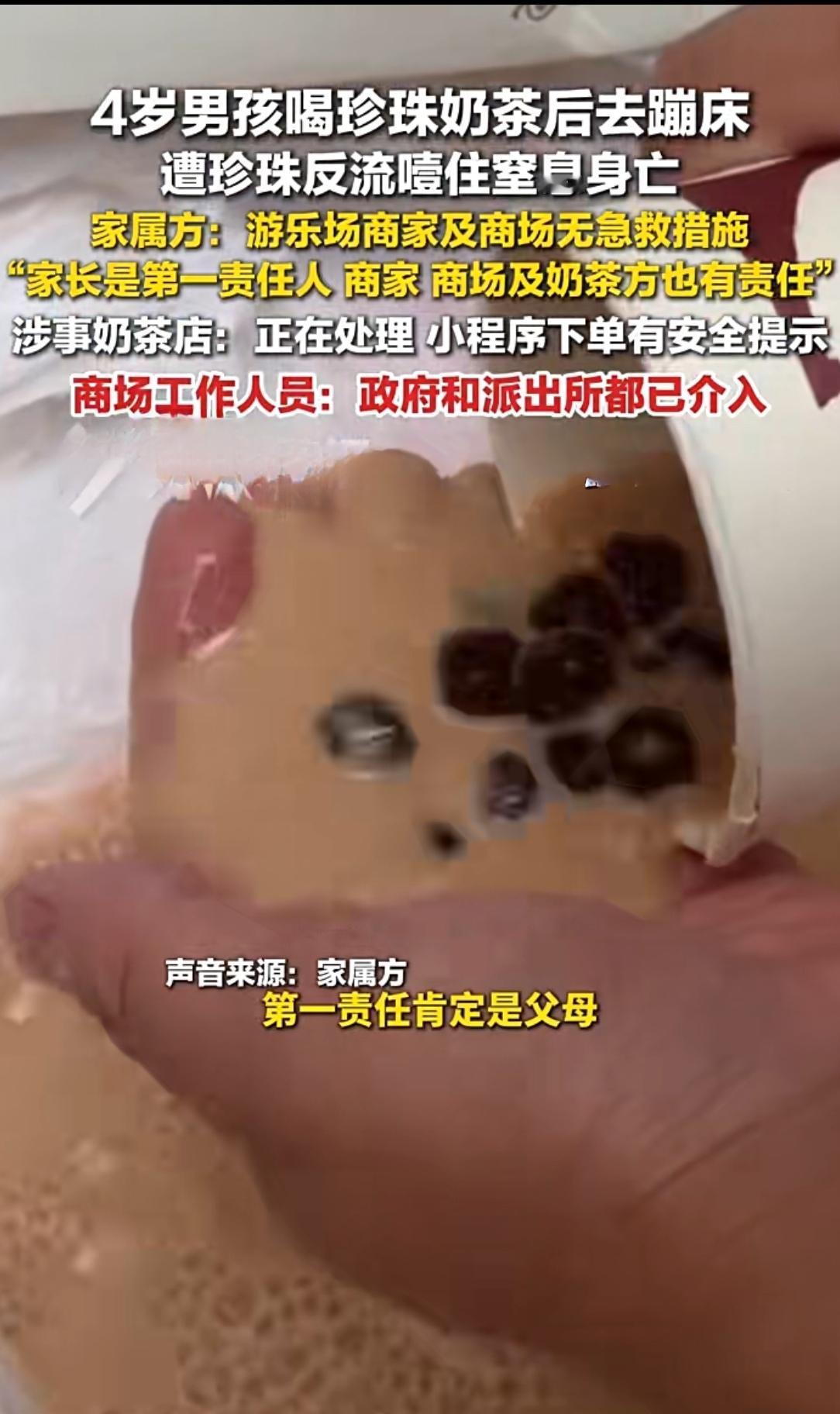 警惕!浙江4岁娃喝珍珠奶茶蹦床,一颗珍珠夺走性命! 浙江台州4岁男童喝完珍珠奶茶蹦床时窒息身亡,罪魁祸首竟是滑溜溜的珍珠反流堵塞气道,原本的开心时光瞬间变成家庭噩梦。 这珍珠看着Q弹可爱,对低龄娃来说就是“隐形杀手”。质地滑腻难吞咽,孩子蹦跳时腹腔压力一增,珍珠直接反流呛进气管,抢救都来不及。 家属哭到崩溃,质疑奶茶店没尽到提醒义务。买的时候没口头告知风险,店里连个“孩童吃珍珠需监护”的告示都没有,要是早知道这隐患,绝不会让孩子边玩边吃。 更让人惋惜的是,家长就在旁边却踩了坑。孩子摔倒哭闹时以为是磕碰,等发现呼吸异常,最佳抢救时间早溜走了。这也给所有家长提了醒:娃进食时千万别掉以轻心。 其实类似悲剧早不是第一次。江苏3岁女童吃果冻跑跳窒息,广东男童边玩边吃花生险些丧命,这些常见零食对娃来说都藏着雷。 奶茶店不能只卖货不提醒,产品风险告知得做到位。家长更得绷紧安全弦,娃吃这类食物时必须全程盯着,远离跑跳、哭闹等危险动作。 珍珠虽小风险大,安全提醒和监护缺一不可!这起悲剧,真该让所有商家和家长都记牢教训!奶茶异物事件 2岁幼童溺水 男童坠井 男童意外身亡 作者声明:素材来源网络