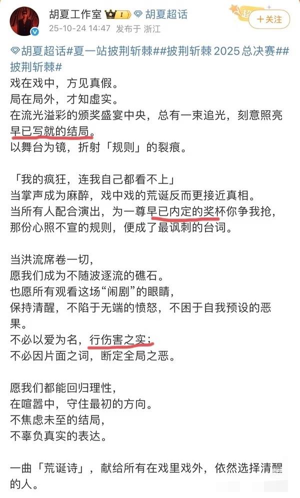 胡夏工作室这篇文章疑似内涵披哥奖项有剧本。 一句“戏在戏中,方见真假”道出端倪。 还有一句“刻意照亮早已写就的结局”更有深意。 然后就是“为一尊早已内定的奖杯你争我抢”,太像是撕开了节目的内幕。 其实这一季披哥哥哥们都很优秀,只不过快乐老咖综合实力很强,而且在流量上更为突出一些,他们后期与🥭台更有深度的绑定。