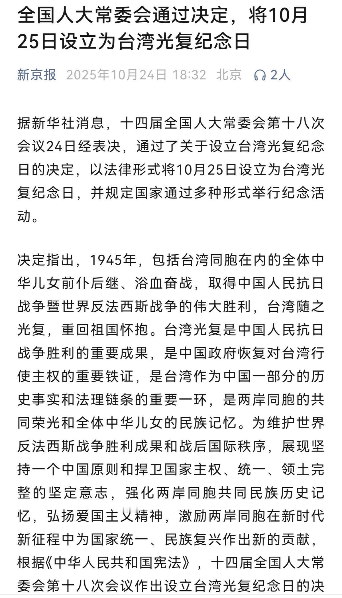 10月25日,台湾光复纪念日! 据央视报道,经人大表决通过,决定以法律形式设立台湾光复纪念日,日期定为10月25日,即1945年中国战区台湾省受降仪式举行的那天。以后每年的这一天,国家都将举行多种形式的活动,纪念台湾光复。10月25日设立为台湾光复纪念日 这一决定不仅是对历史事实的再确认,更是对国家统一意志的再宣誓。在两岸关系面临复杂挑战的当下,这一决定不仅是对历史事实的再确认,更是对国家统一意志的再宣誓。 首先,1945年10月25日,台湾正式结束日本殖民统治,回归祖国怀抱,这是中国人民抗日战争胜利的重要成果,也是国际社会公认的历史事实。联大第2758号决议早已从政治和法律上彻底解决了包括台湾在内的全中国在联合国的代表权问题,充分确认了台湾是中国不可分割的一部分。设立台湾光复纪念日,正是以国家立法的形式固化这一历史共识,对抗任何企图扭曲历史、曲解联大决议的行径。 其次,这一决定彰显了国家主权意志的连续性,再次从法理上确认了“台湾是中国的一部分”这一事实。从《开罗宣言》、《波茨坦公告》到今天的台湾光复纪念日设立,中国政府对台湾主权的立场一以贯之。在当前国际形势下,某些国家试图打“台湾牌”牵制中国发展,我们更需通过此类法定纪念日向国际社会清晰传递一个中国原则的不可动摇性。 第三,纪念活动是民族记忆的传承工程。通过国家层面的纪念仪式,能够唤醒两岸同胞共同的历史记忆,强化血脉相连的民族认同。近年来,岛内某些政治势力推行“去中国化”教育,企图割裂台湾与大陆的历史文化联系。在此背景下,设立光复纪念日犹如一剂清醒剂,提醒人们不要忘记两岸并肩抗击外侮的光荣历史。
