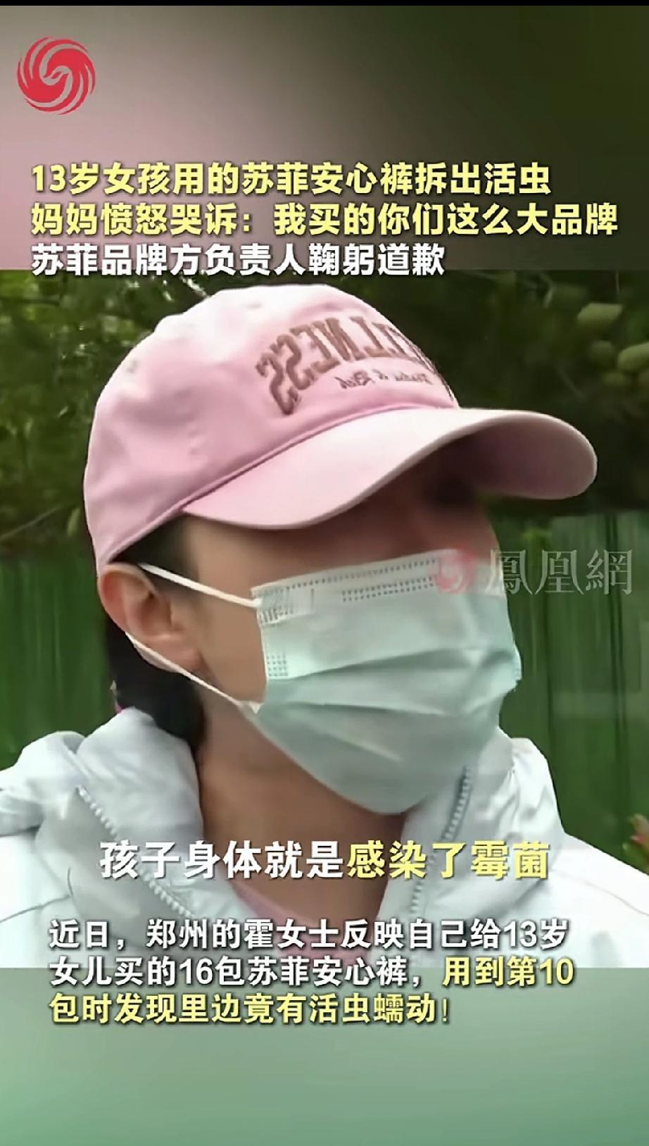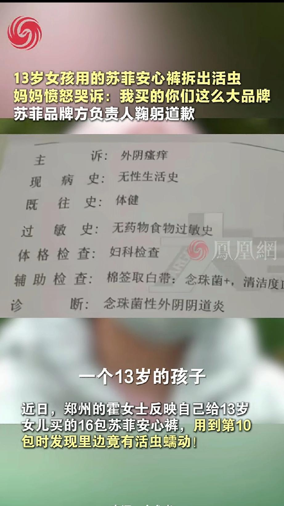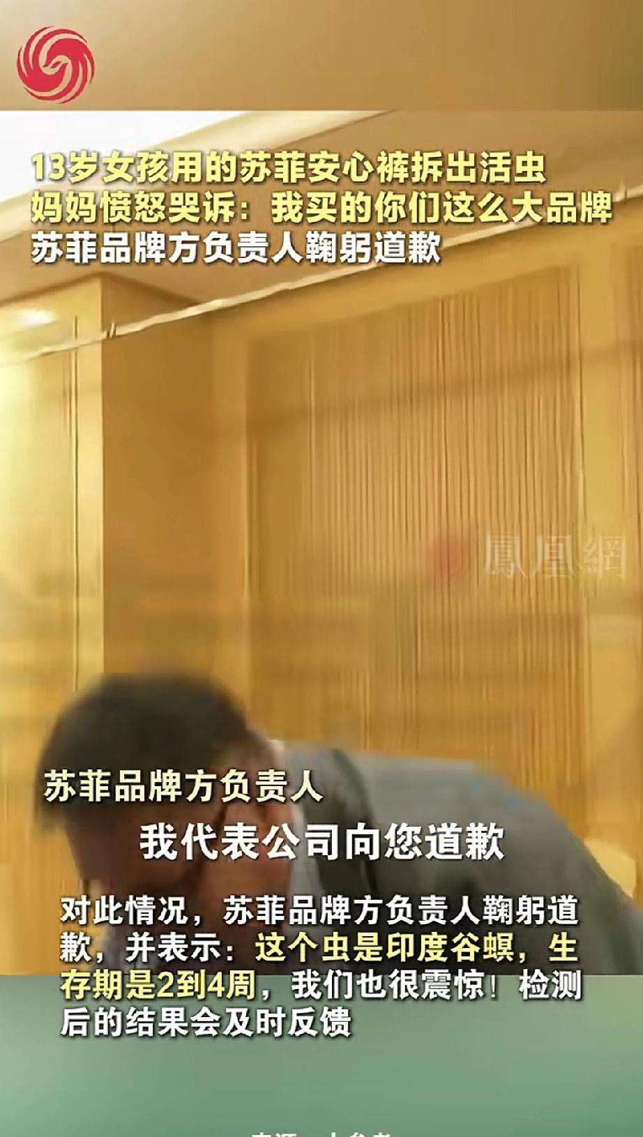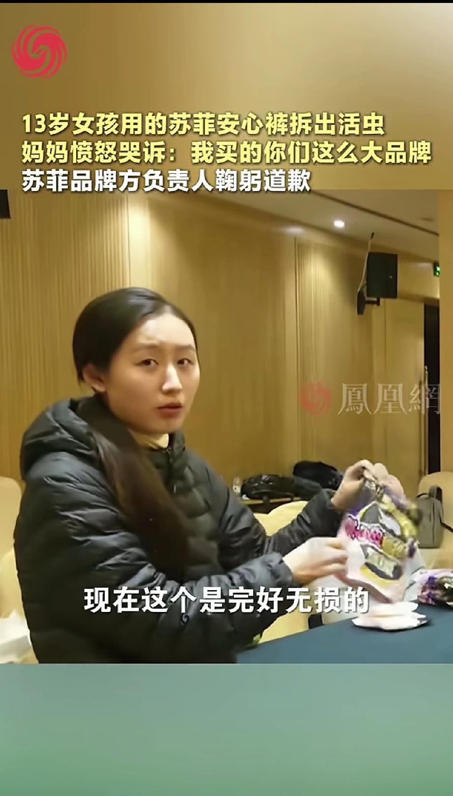 苏菲卫生巾被女记者当场拆出活虫! 本来是家属哭诉13岁女儿,无性生活史却感染霉菌。 后来发现是苏菲卫生巾里有虫子。 一开始厂家还各种理由推脱责任,但直到记者现场拆开一包,发现也有虫子,厂家负责人只好鞠躬道歉。 但我想说,道歉都有用,还要法律干嘛呢? 本身苏菲就比很多牌子贵了。