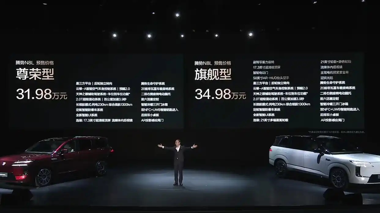 很明显,同样是高端车型,现在定义不一样了。以前传统豪华看logo,现在新能源豪华看黑科技。当你还在BBA的入门款里纠结配置时,国产黑马已经用30万级的定价,干出了百万级的性能。在腾势N8L预售发布会上,公布的价格是31.98万元至34.98万元,如果28号正式上市,这个价还能再低点,那真可以说是撕开了豪华车市场的溢价遮羞布了。