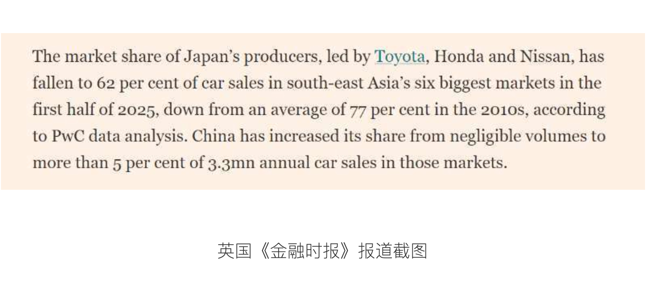 中国汽车的崛起,让海外媒体刮目相看,今年10月,彭博社报道称,中国制造商正瞄准欧洲不断增长的电动化汽车市场,其高性价比车型给大众汽车集团等当地传统车企带来竞争压力。而英国《金融时报》则称,中国平价电动汽车销量的飙升,打破了日本汽车制造商数十年来对东南亚市场的垄断。